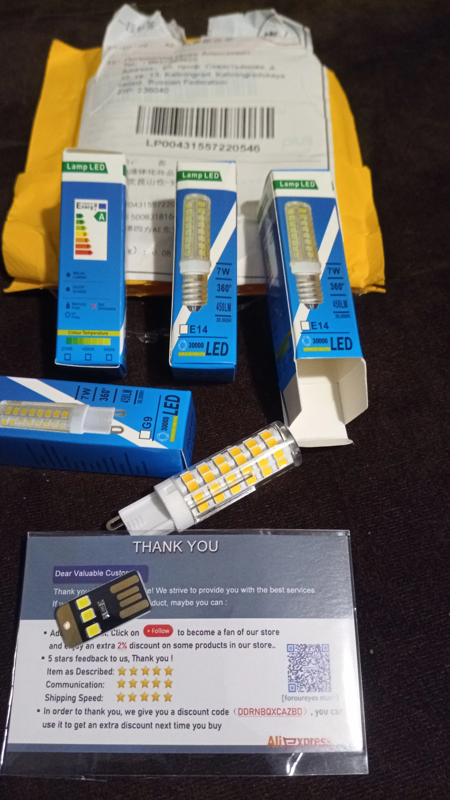 Отличный товар. Пришло в Сочи менее 2 недель, забрал на кассе Пятерочки у дома. Продавец в подарок положил фонарик от USB. Молодец. Лампы работают!