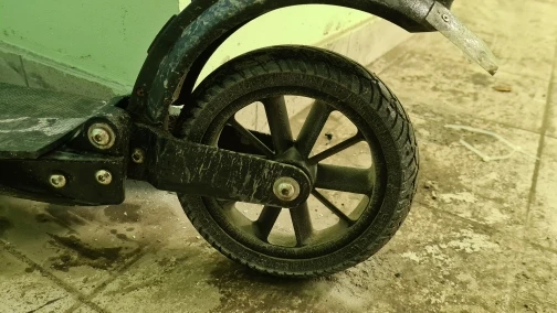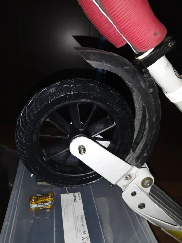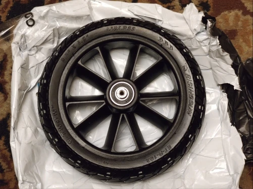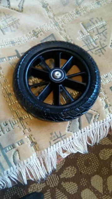 Колесо резиновое, покупалось на самокат Kuga S3 взамен заднего оригинального из полиуретана. Ставлю 4 звезды, т.к. колесо имеет биение по типу восьмёрки, вдоль плоскости вращения. Считаю, что за такие большие деньги (3800 руб.), качество исполнения должно быть лучше.