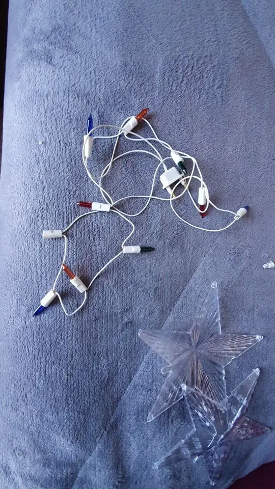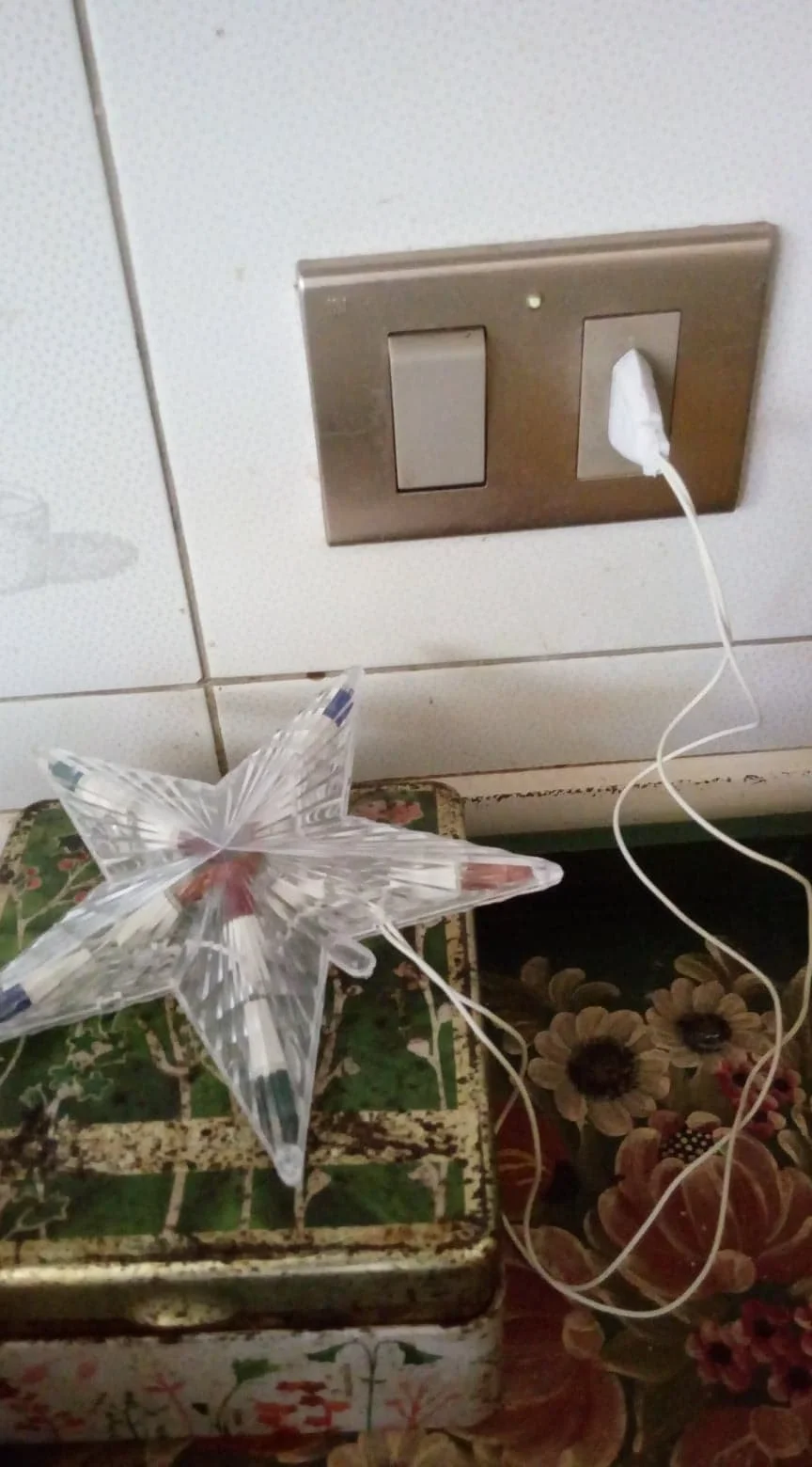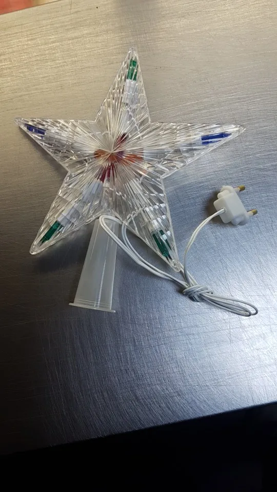 Товар прибыл поврежденным, разбит угол звёзды, лампочка не горит, провод около 25-28 см, розетка малюсенькая, хлипкая ( и как вы себе представляете это можно подключить, когда верхушка на ёлке, ну уж так экономить могут только китайские евреи).