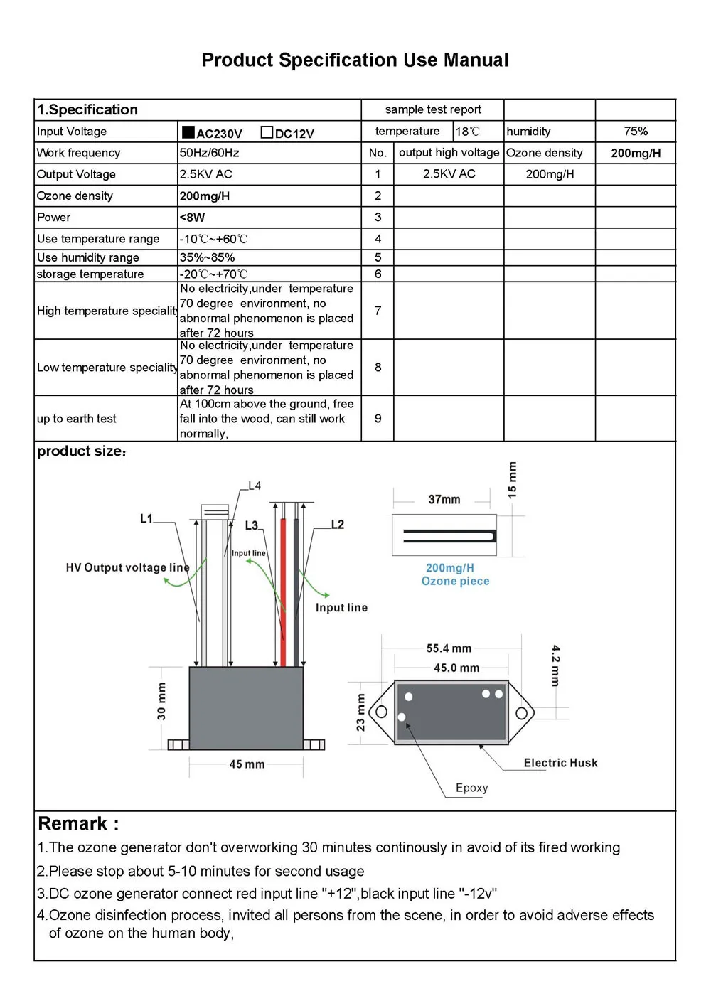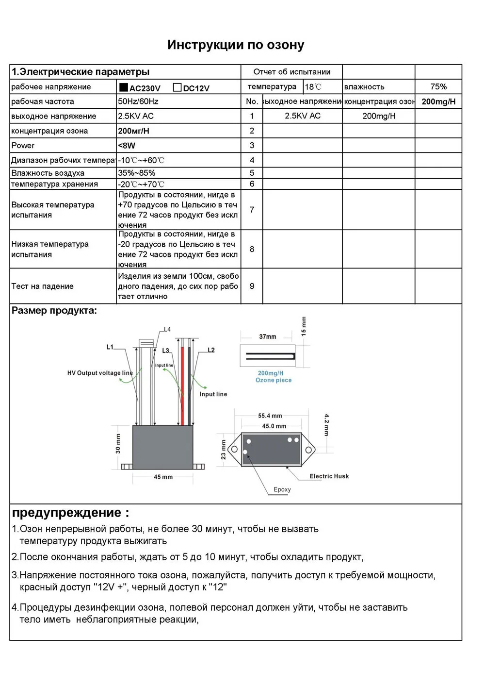Меры предосторожности: 1. Озон не может работать непрерывно, самые длинные рабочие часы не должны превышать 20 минут.2. Озон работает каждые 5-10 минут, нам нужно прекратить отдыхать в течение 2-3 минут, чтобы продукт лучше рассеивал тепло,3. Генератор озона постоянного тока подключается красная Входная линия "+ 12", черная Входная линия "-12 в"4.Керамические элементы озона очень легко ломаются, пожалуйста, нажмите на ошибку, летучие мыши, Электрический паяльник, паяльное давление и температура (350 ~ 400 градусов), чтобы избежать разрыва керамических деталей,