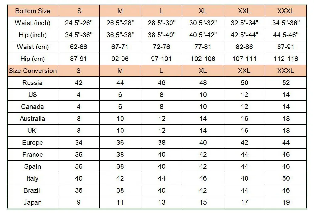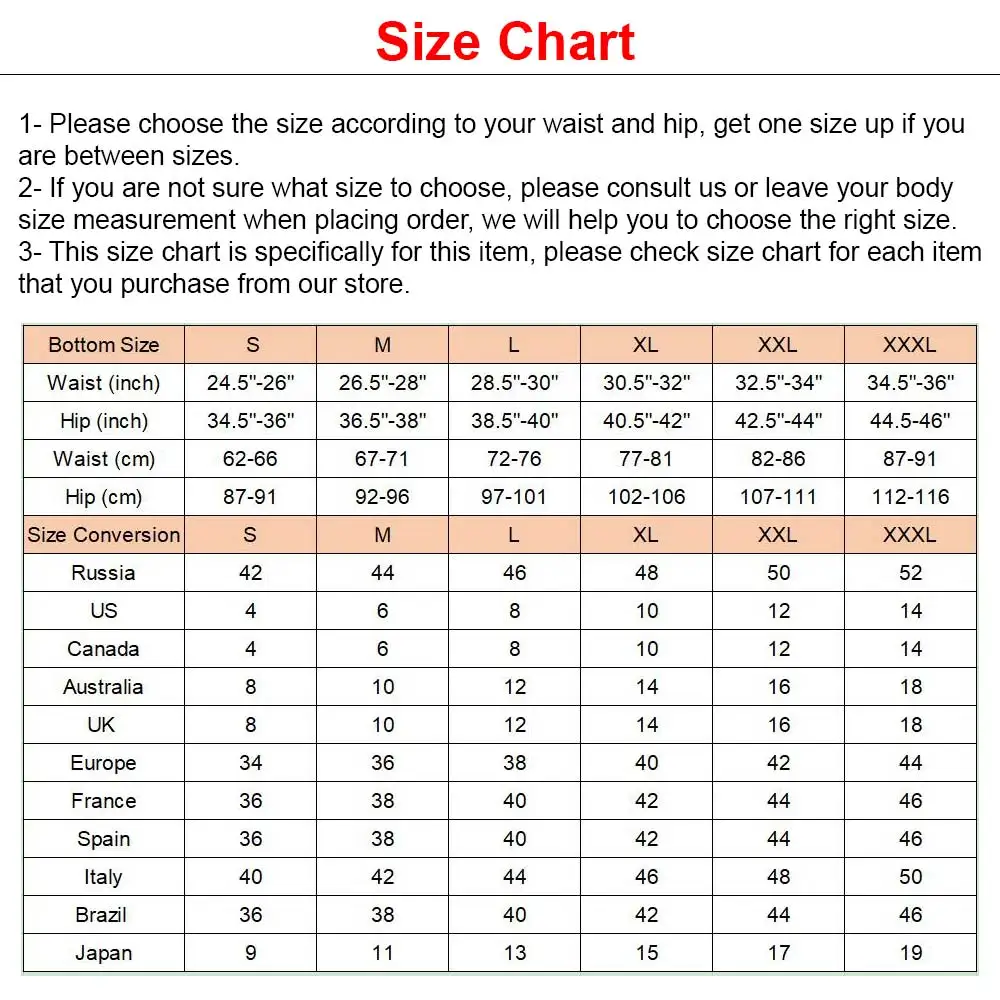 1. Пожалуйста, выберите размер в соответствии с вашей талией и бедер, получите на один размер больше, если вы находитесь между размерами.