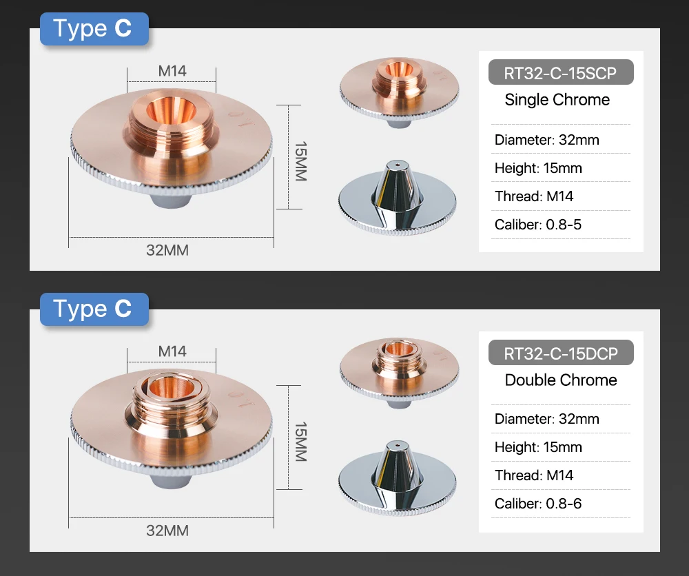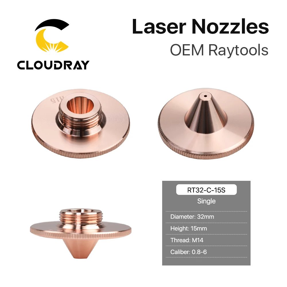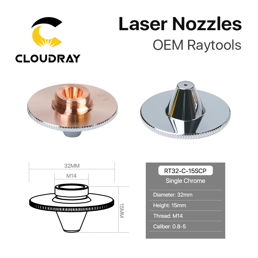 Форсунки Cloudray Raytools типа C TQ Dia.32 H15, однослойные, хромированные, двухслойные s-образные 0,8-5,0 мм для режущей головки