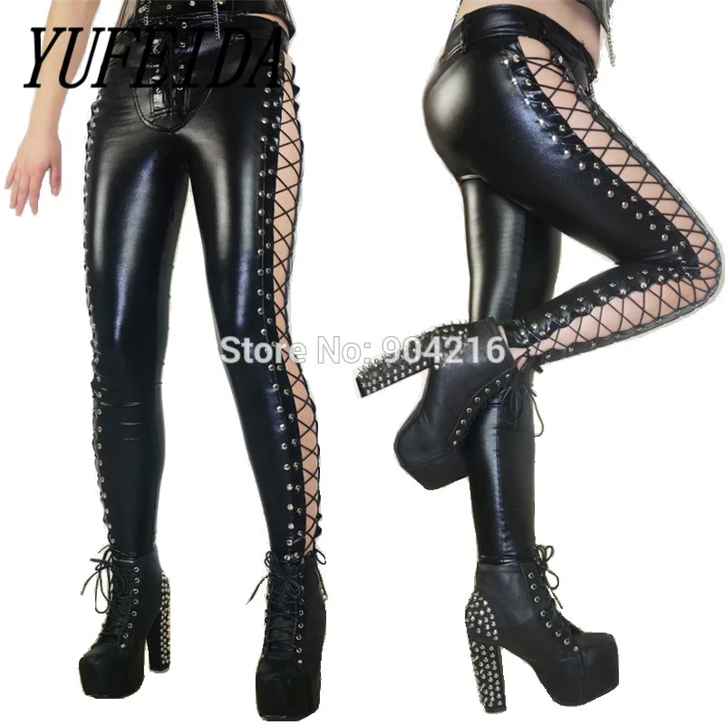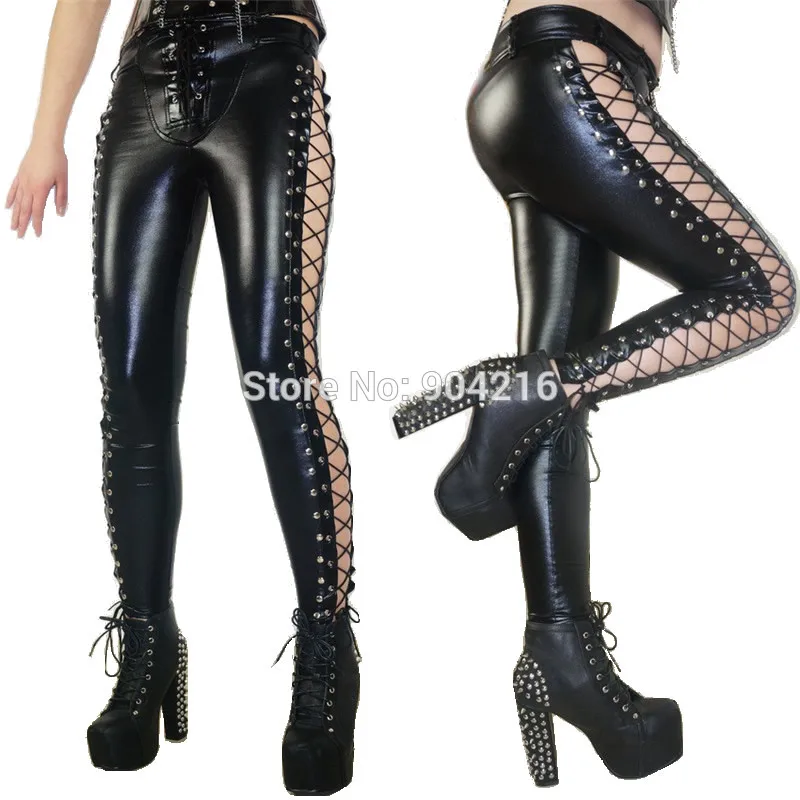 Женские кожаные брюки WetLook, леггинсы из искусственной кожи, женские узкие брюки с боковой шнуровкой, открытые брюки, женская уличная Клубная одежда