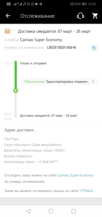 Страна: BY Доставка: Cainiao Super Economy 18.03.2021