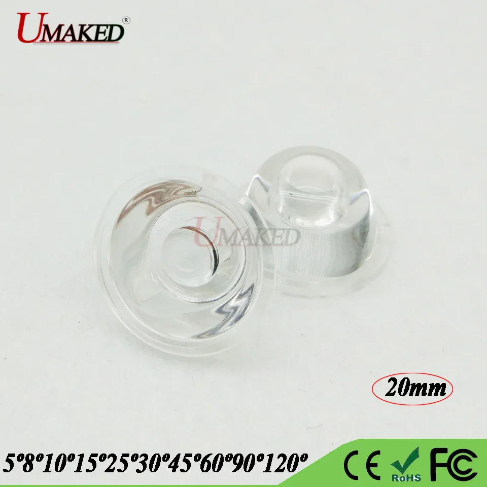 Линза светодиодная, 20 мм, из ПММА, с гладкой поверхностью 5, 8, 10, 15, 25, 30, 45, 60, 90, 120 градусов