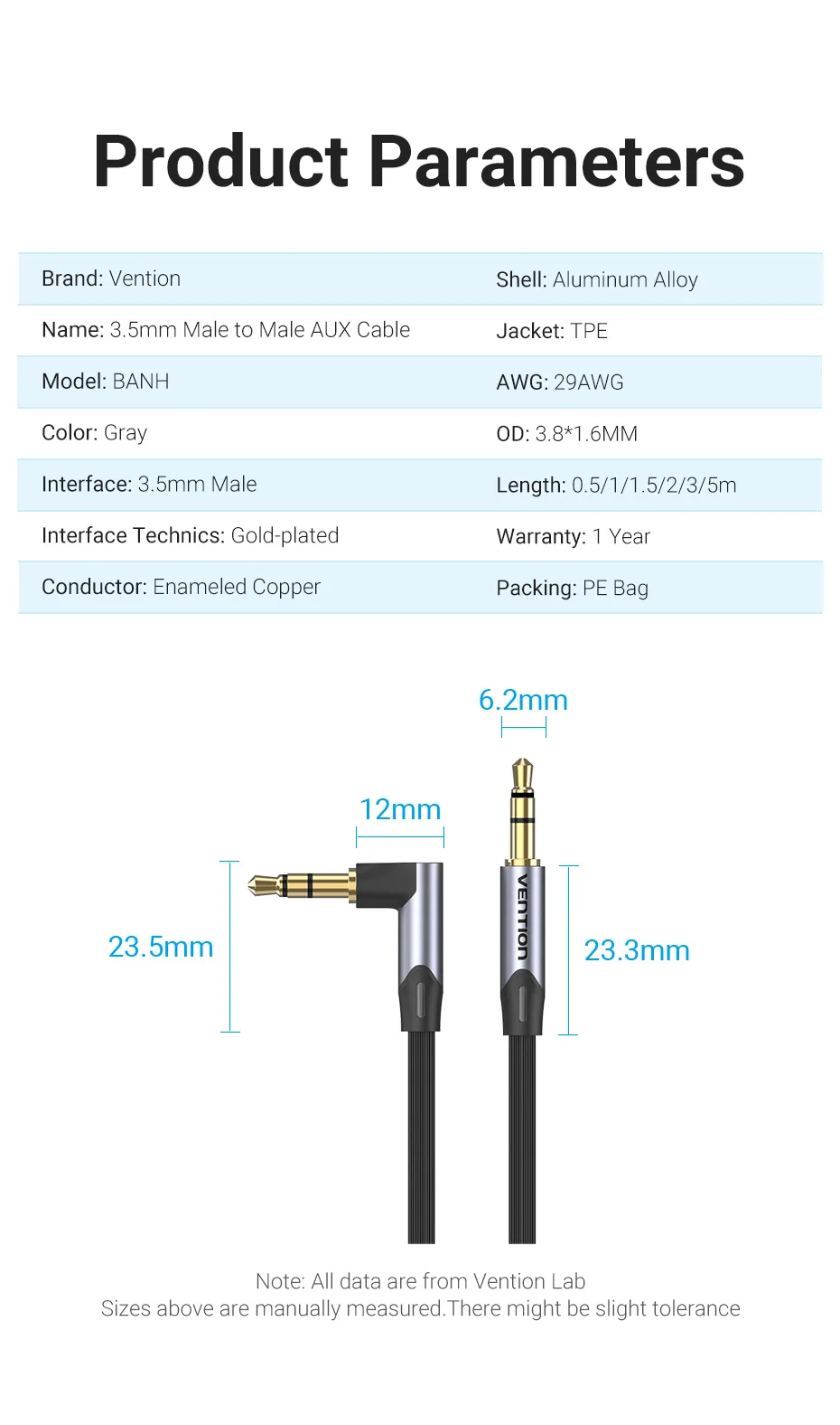 Кабель Vention Aux, штекер 3,5 мм, аудиокабель 90 градусов под прямым углом 3,5, шнур AUX для автомобильных наушников, Xiaomi, Beats, динамиков, MP4 шнур AUX