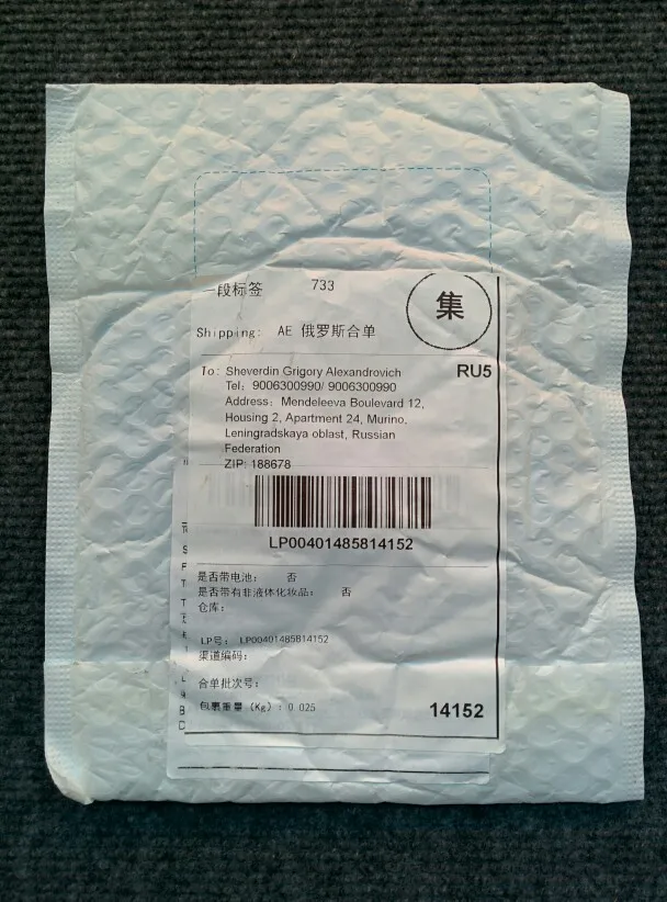 Заказ пришёл через 18 дней после оплаты. Это очень быстро! Трек не отслеживался, продукт бросили в почтовый ящик. Товар отличный, всё работает! Продавцу большое спасибо! Итог: Товар: Товар отличный! Рекомендую! Продавец: Ответственный, честный. Рекомендую! Доставка: Отлично! Доставку Cainiao рекомендую!