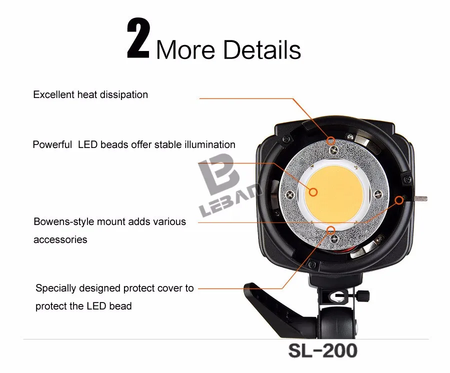 SL-200W имеет 95 CRI +, с мощным выходом 12000 люкс на 1 метр (100% выход). Благодаря высокой скорости запуска и перезагрузки, гарантированный, антибликовый и более 100000 часов советы помогут продлить срок службы изделия. Godox SL-200W имеет Bowens S тип, 3 точечная система крепления-позволяет использовать большой различные светильник модификаторы, включая софтбоксы отражатели красота посуды, на веревочке, сетки и многое другое.