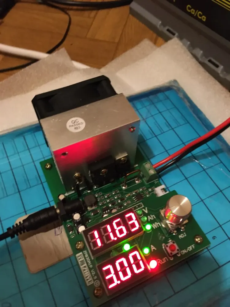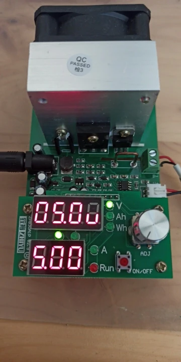Всё отлично, доволен. Измеряет Ah и Wh. Два режима: Fun1 - электронная нагрузка, Fun2 - тест аккумулятора (держать нажатой кнопку On/Off при подаче питания). Версия прибора попалась v2,9. Шунт стоит на 10мОм. Транзистор с маркировкой IRFP150N, при проверке автомобильного АКБ 12в 60Ач на токе разряда 4,5А грелся выше 90С (если верить пирометру направленному прям на корпус транзистора). Защитный диод от переполюсовки стоит с маркировкой STPS3045CT. На микроконтроллере маркировка STM8S005K6T6C. Показания тока достаточно точные (фото 4). Напряжение будут точнее при четырёхпроводном подключении (фото 5). Если тест закончит измерения и пропадёт питание, показания он помнит. Если после окончания теста зайти энкодером и посмотреть результаты, то после пропадания питания результаты сотрутся. Если питание пропадёт при тесте и опять появится, тест - продолжится, результаты сохраняются. Прибор приехал в надувном контейнере и в почтовом пакете. Выслали через день. Доехало за 12 дней. Отслеживалось.
