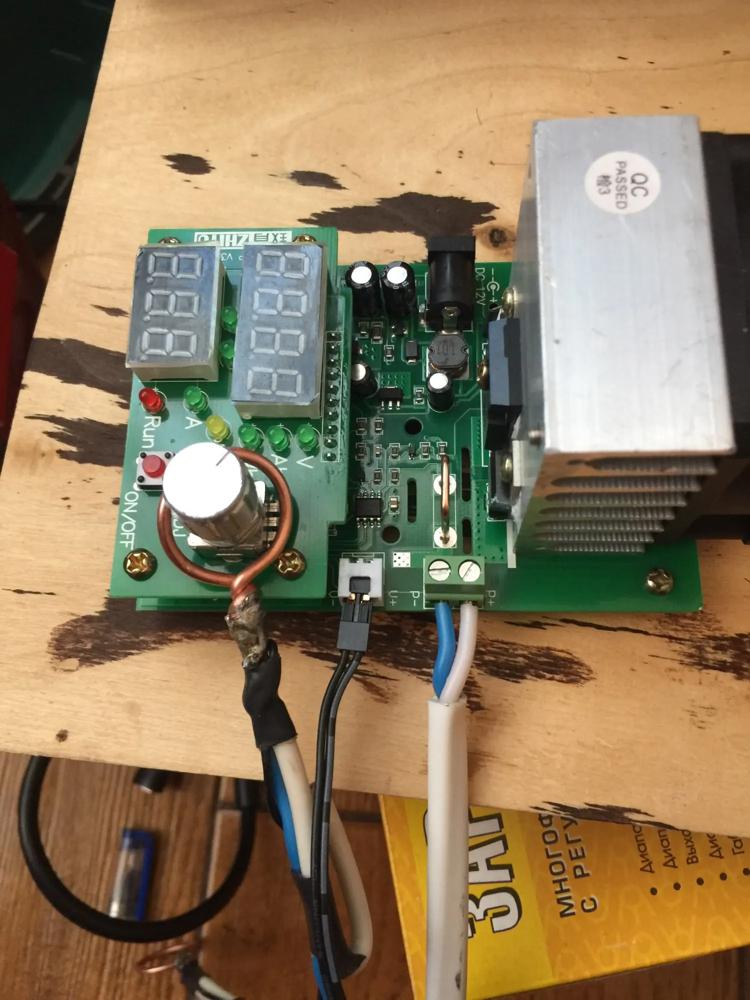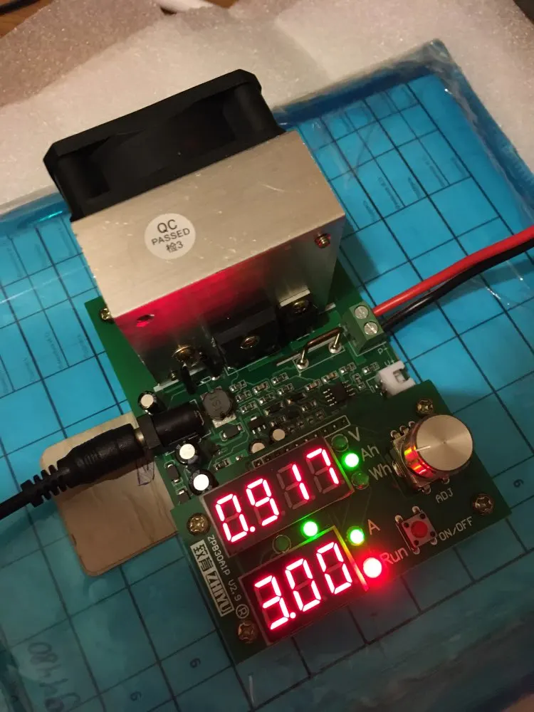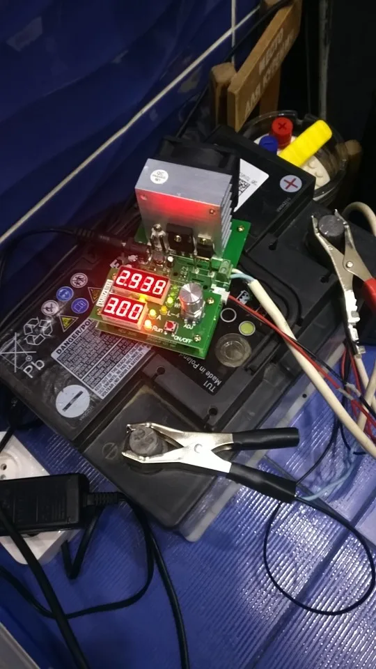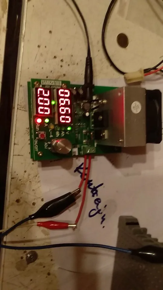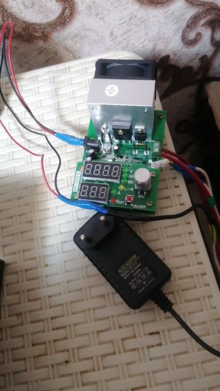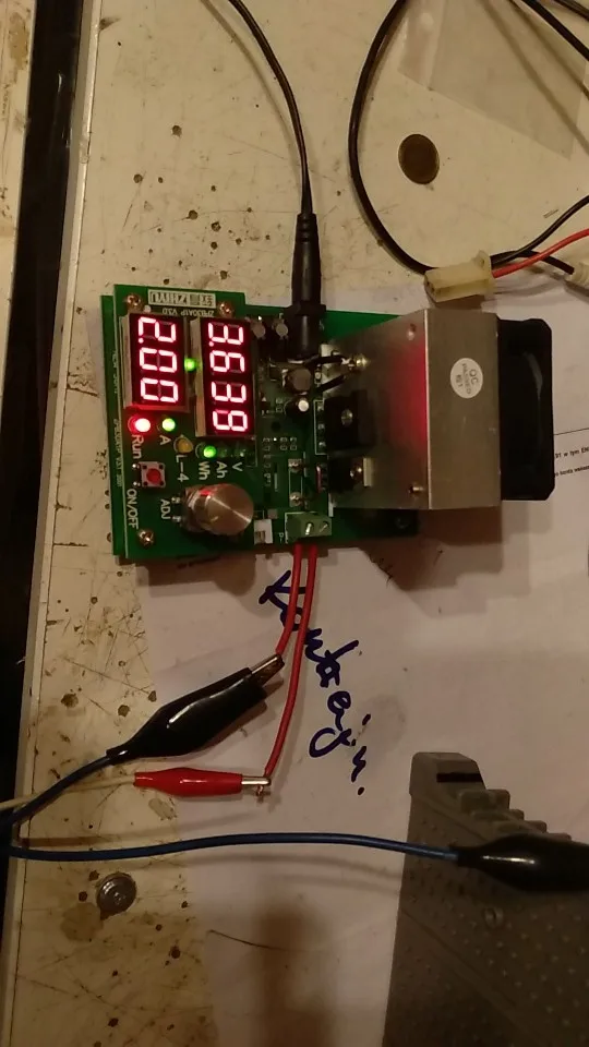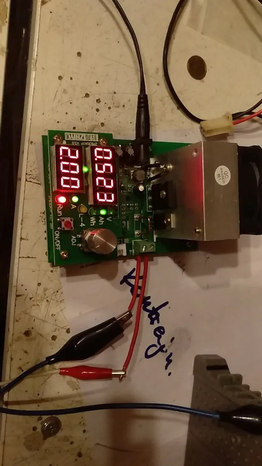 Прибор пришёл в М.О. быстро 2-3 недели. Плата полностью рабочая для выбора режима тестирования АКБ при включении необходимо держать нажатую клавишу Run. Из-за не имения крокодилов под рукой, сделал (заколхозил) клеммы из провода 4мм. Для дополнительного вольтметра подходит провод от компьютерного корпуса power или reset.