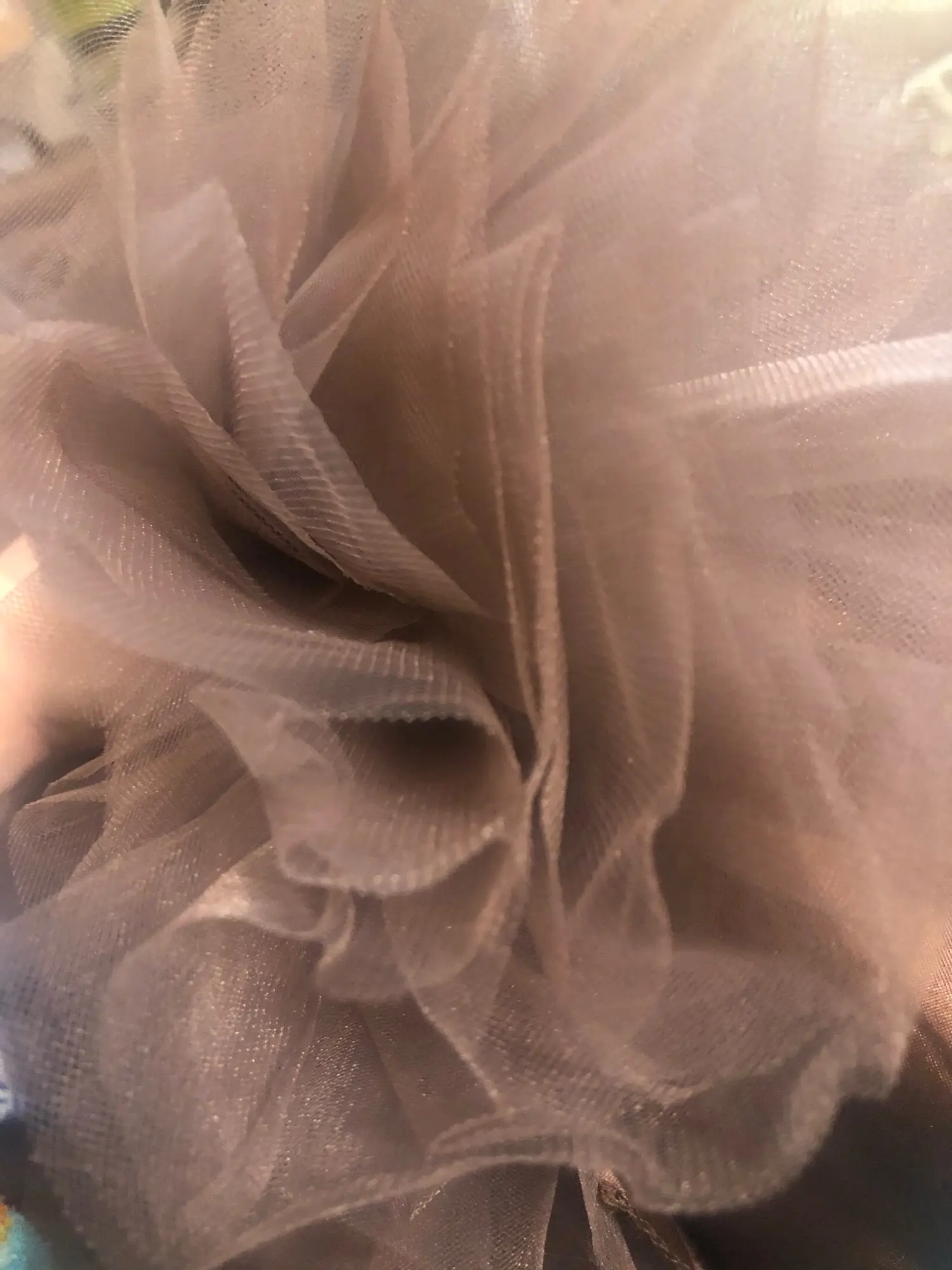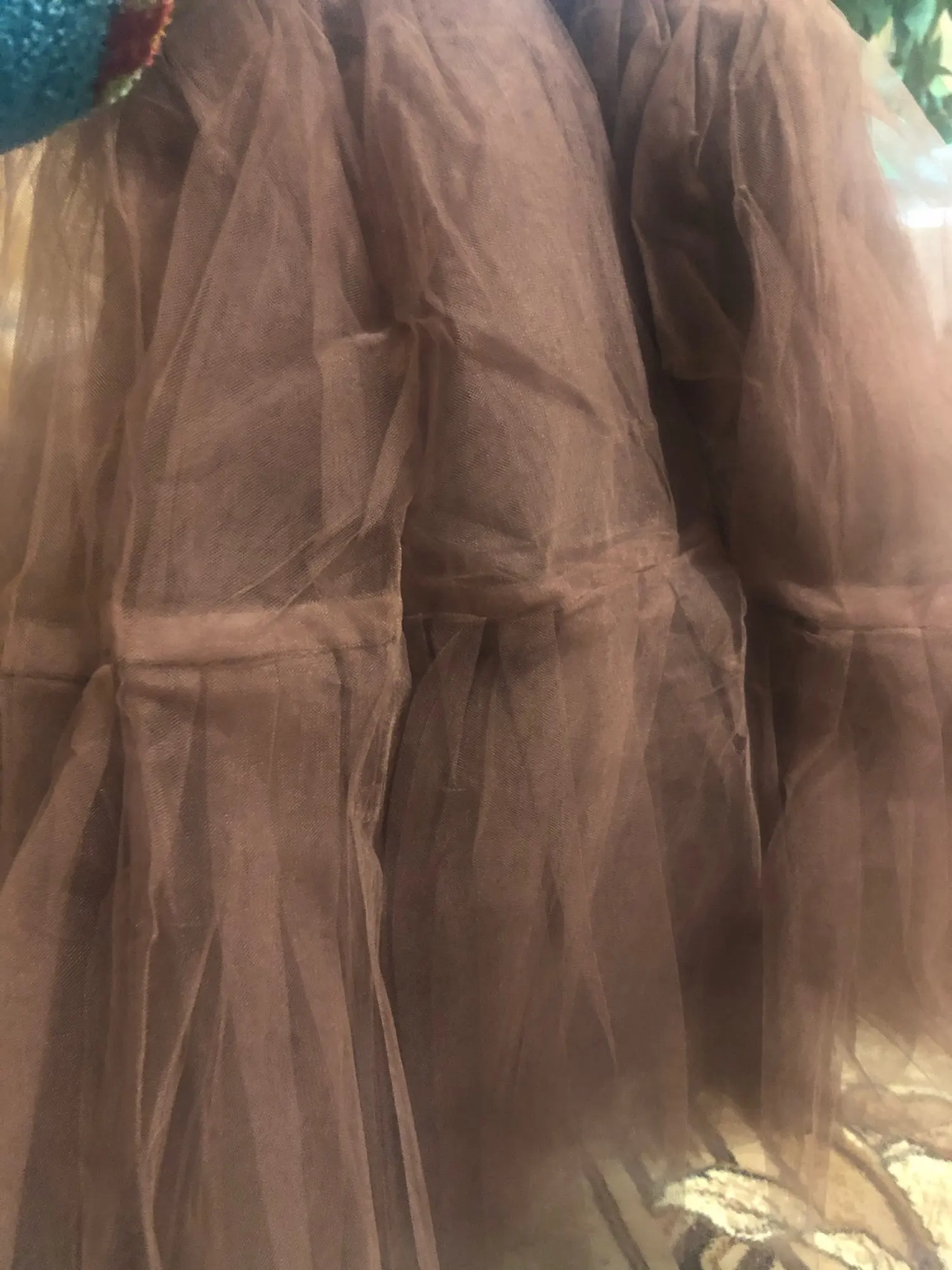 Тюль хорошего качества, мягкий. Крой юбки - полное "солнце." Коричневый цвет мягкий, немного с" дымкой ". На мой вкус, подъюбник длинноват и очень блестит. Но у кого руки могут держать иголку, то можно сделать под себя. Качество шитья, кроя и материала хорошее.