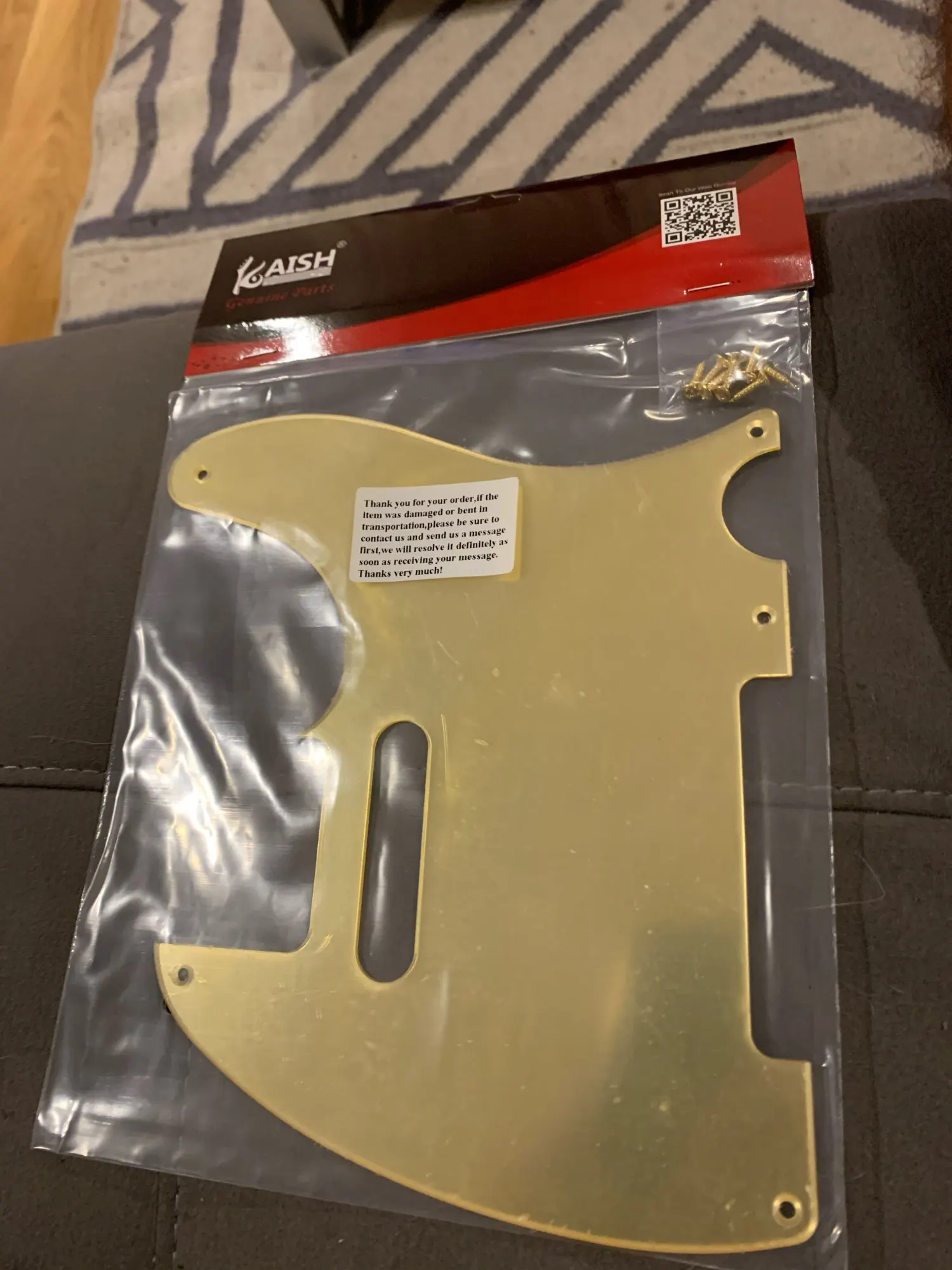 The pickguard arrived in three weeks. It was well packaged and appears to be of high quality plastic. Despite what the item description says, it *does* actually fit my Squier 50's Classic Vibe Telecaster perfectly. Looks great, highly recommended!