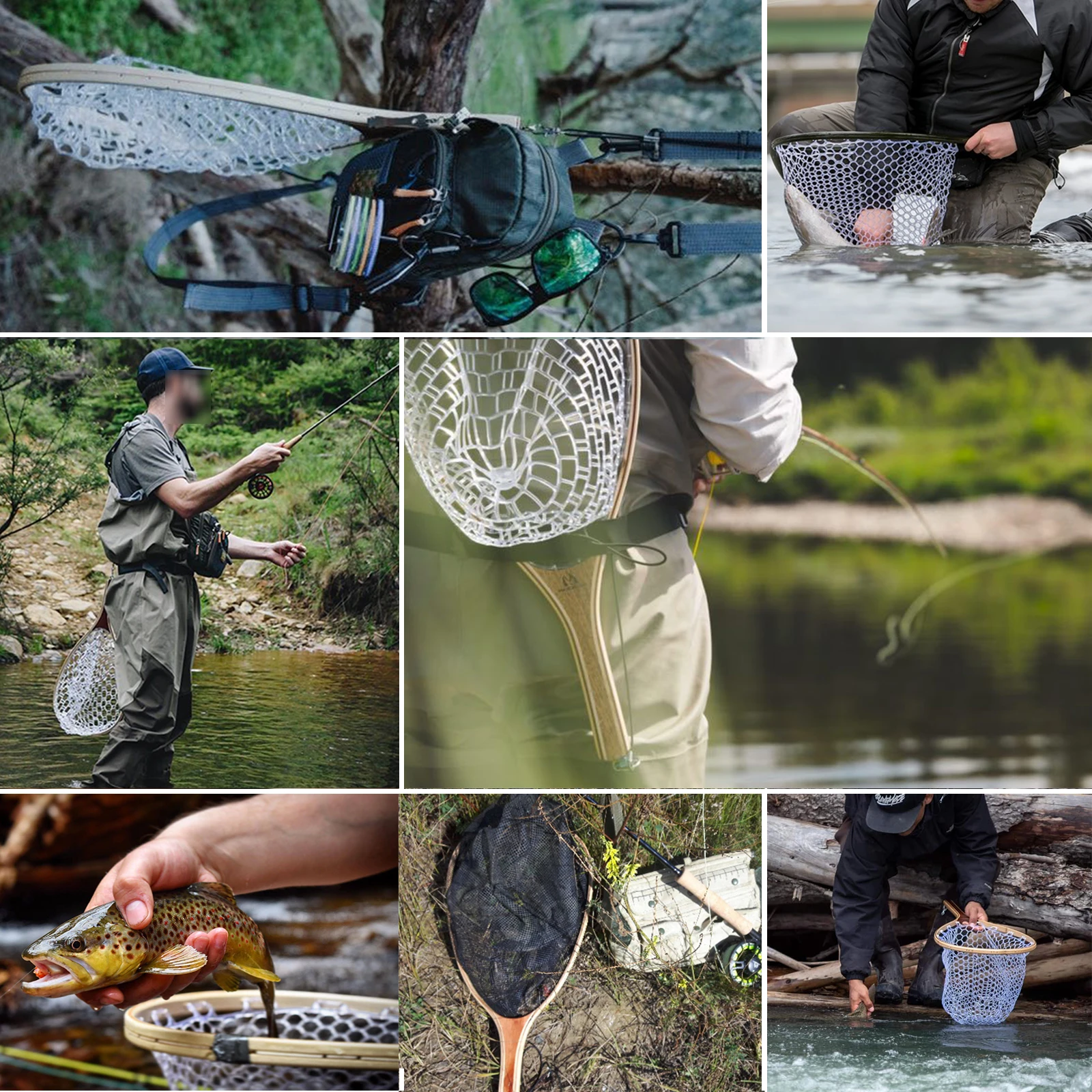 Сачок для ловли рыбы нахлыстом, нейлоновый, с изогнутой деревянной ручкой
