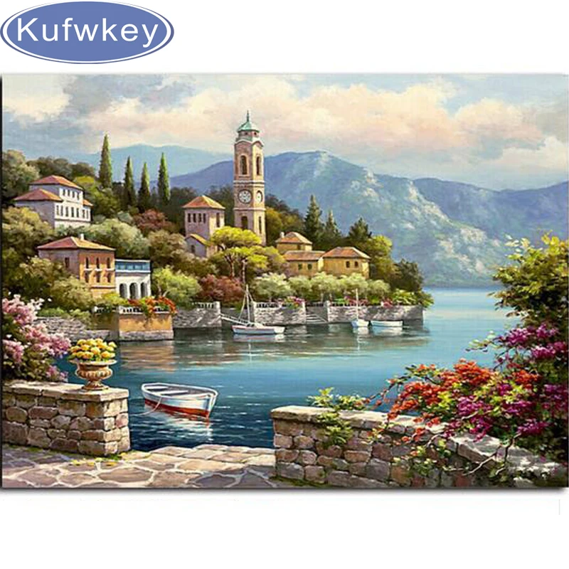 Алмазная вышивка с квадратными стразами, пейзаж, картина 5D, река, дом, цветы, вышивка крестом, алмазная живопись, пейзаж