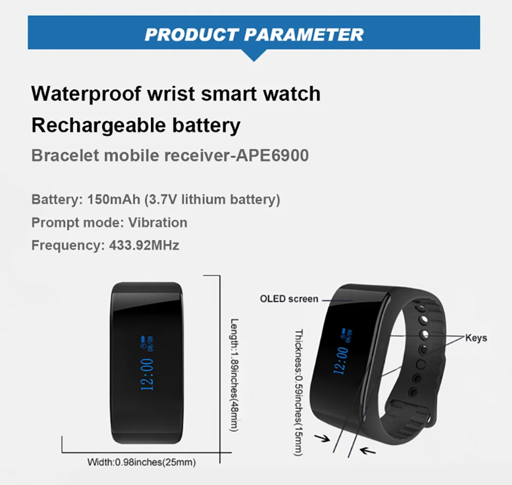 APE6900-это пятое поколение мобильного приемника. Это также первый водонепроницаемый браслет мобильного приемника. Класс водонепроницаемости IPX7. Приемник может использоваться со всеми пейджерами вызова. Он также может быть зарегистрирован и загружен через последовательный порт.