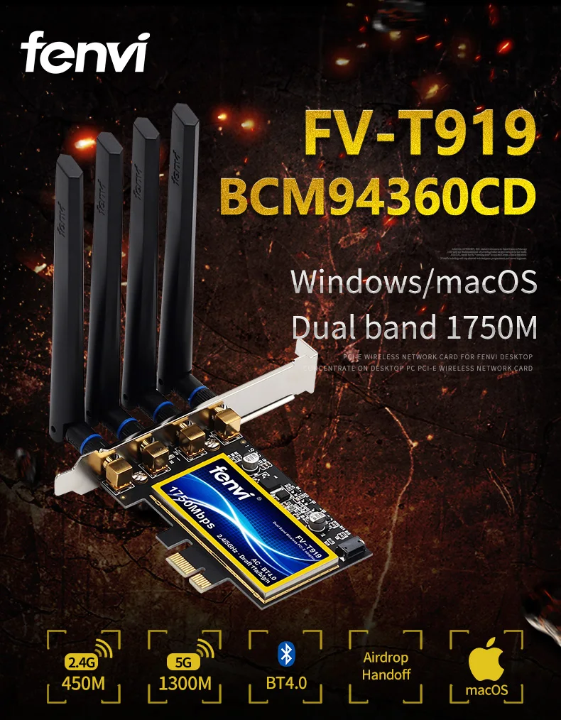 PCIe Wi-Fi карта Fenvi T919 для настольного ПК, 1750 Мбитс, BCM94360 для MacOS Hackintosh 802.11AC Bluetooth 4,0, двухдиапазонный беспроводной адаптер Win10