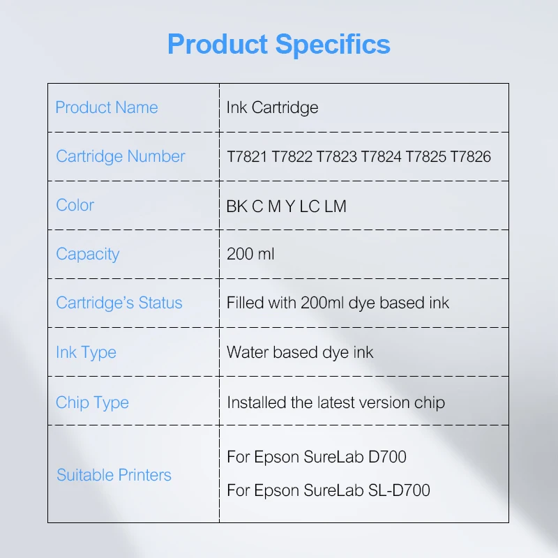 Картридж с чернилами на водной основе, 6 цветовнабор, T7821-T7826, для принтера Epson SureLab D700 SL-D700, 200, млуп.