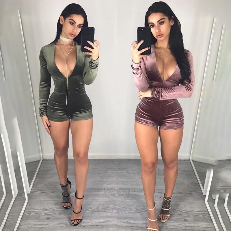 Комбинезон женский короткий с V-образным вырезом, модный пикантный боди с длинным рукавом, бархатный комбинезон, весна 2018
