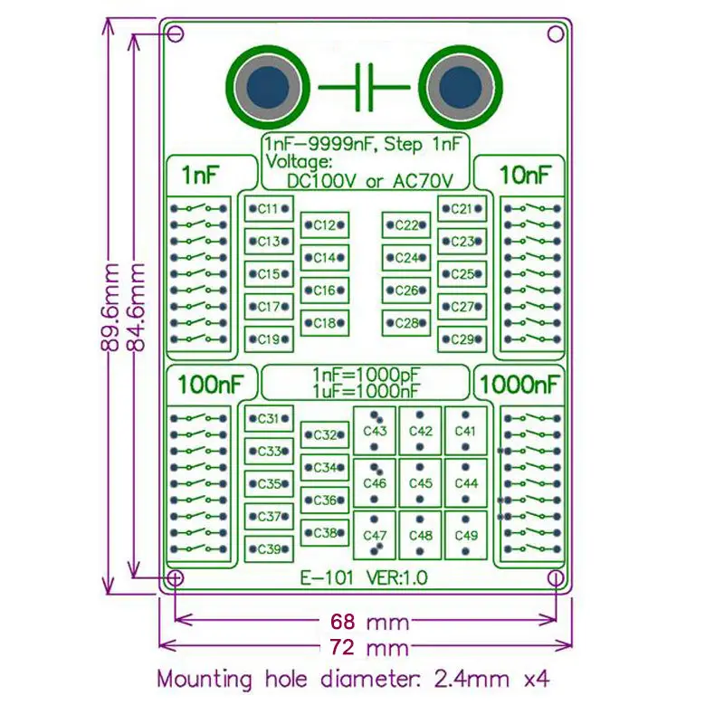 Программируемая Емкость: от 1НФ до 9999нф, 1НФ за шаг.Допуск ёмкости: +/-5%Макс. Рабочее напряжение: 100DC / 70VAC.Размер печатной платы: 89,6x72 мм