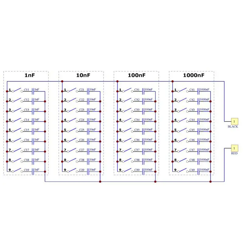 Это «блок замены емкости», хорошее недорогое Альтернативное решение, может гибкая и быстрая настройка диапазона емкости от 1 нФ до 9999 НФ, пошаговая точность 1 нФ. Для образовательных экспериментов отличное применение имеет электронный инженерный дизайн или тестовая обрезка.