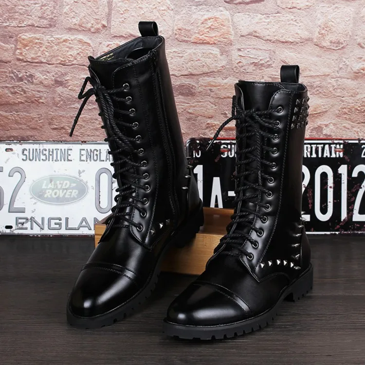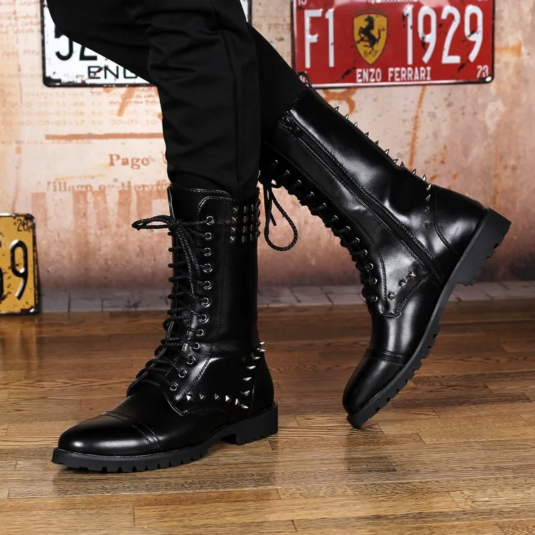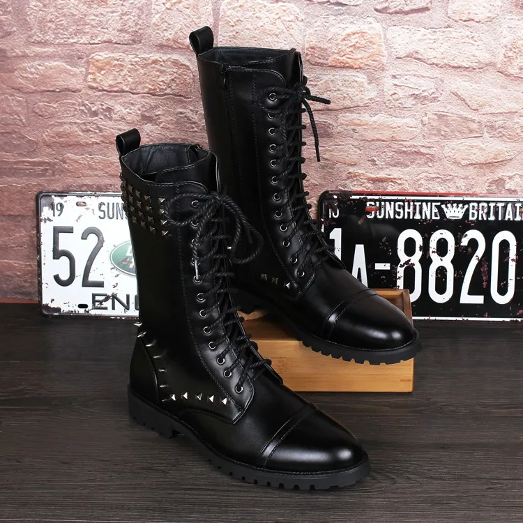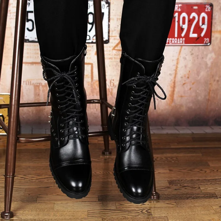 Мужские повседневные мотоциклетные высокие ботинки в британском стиле до середины икры, демисезонные ботинки из натуральной кожи с заклепками, на шнуровке