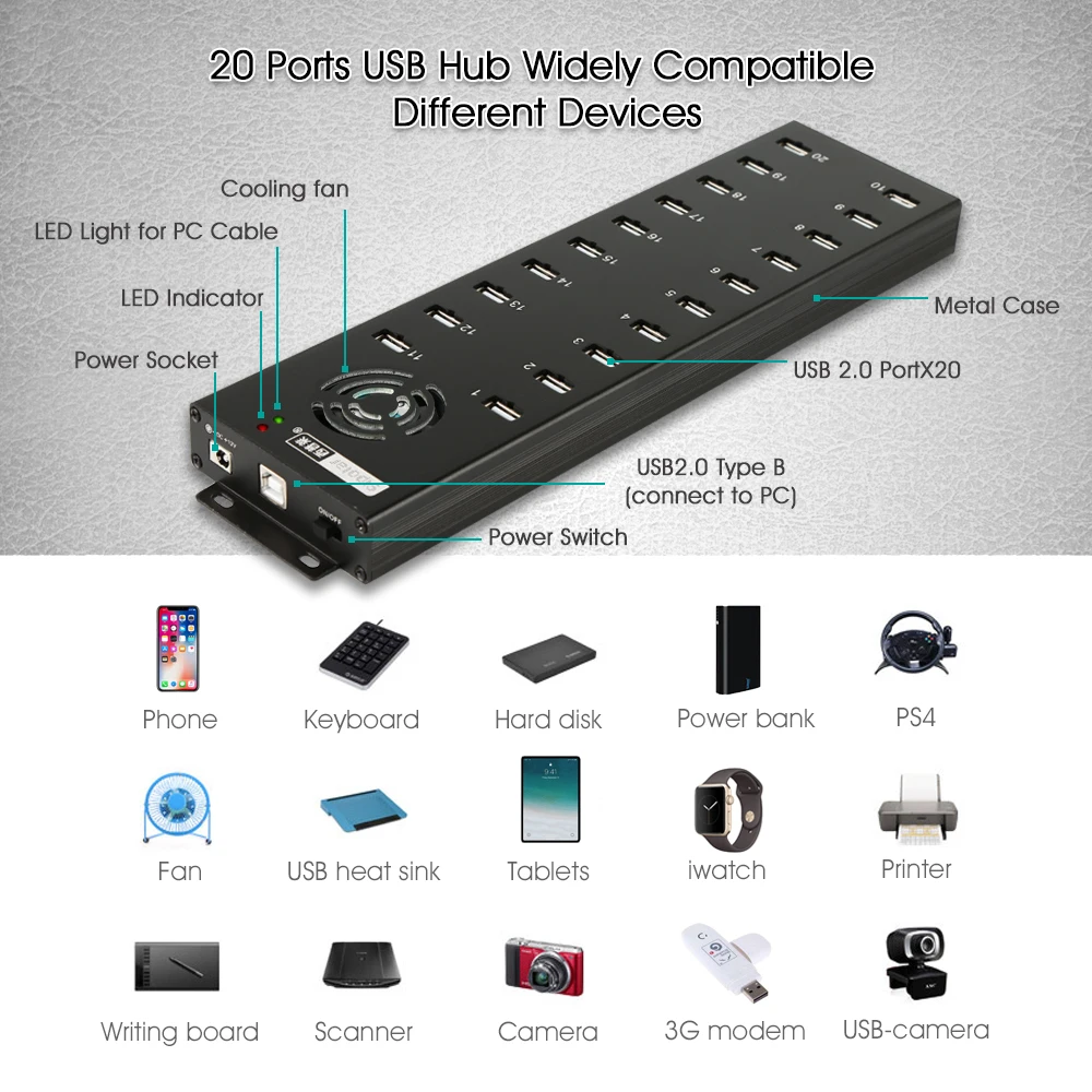 Sipolar 20 портов USB 2,0 HUB с адаптером питания переменного тока 12 В 10 А для периферийных устройств телефонов, ПК, ноутбуков