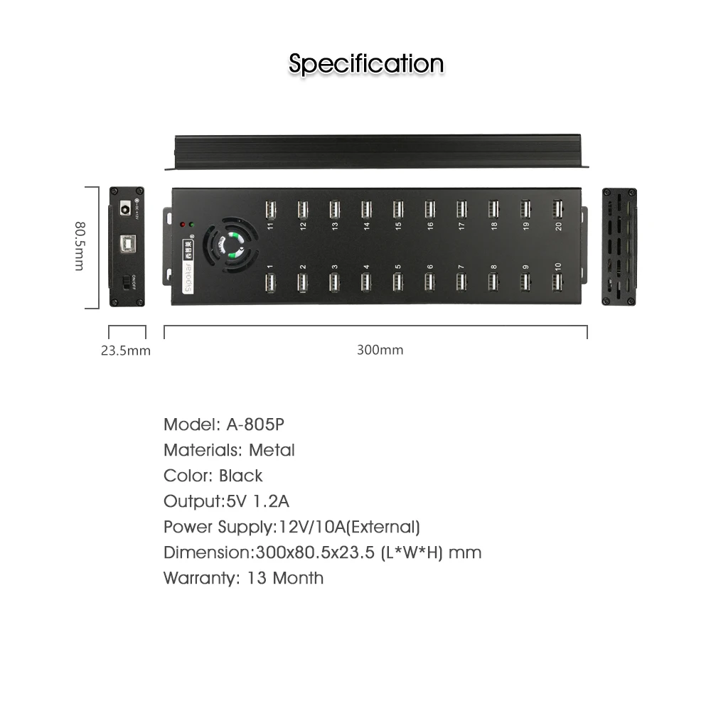 * Поддержка 20 usb-устройств синхронизация данных и быстрая зарядка 1,2 А для телефонов ipad и планшетов с адаптером питания 12 В/10 А.