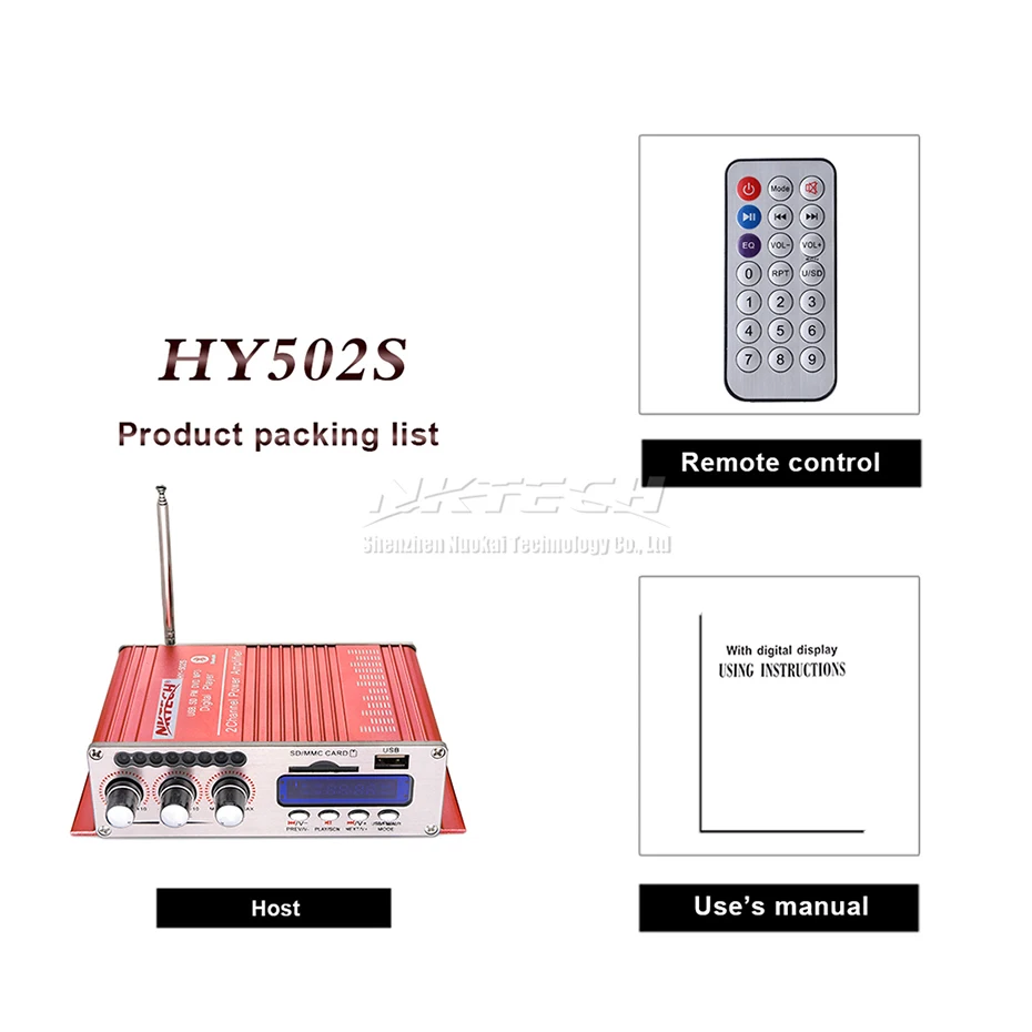 1 х HY502S Hi-Fi Цифровой стерео усилитель красный.1 x NKTECH 3A источник питания.1 руководство пользователя на английском языке.1 пульт дистанционного управления.
