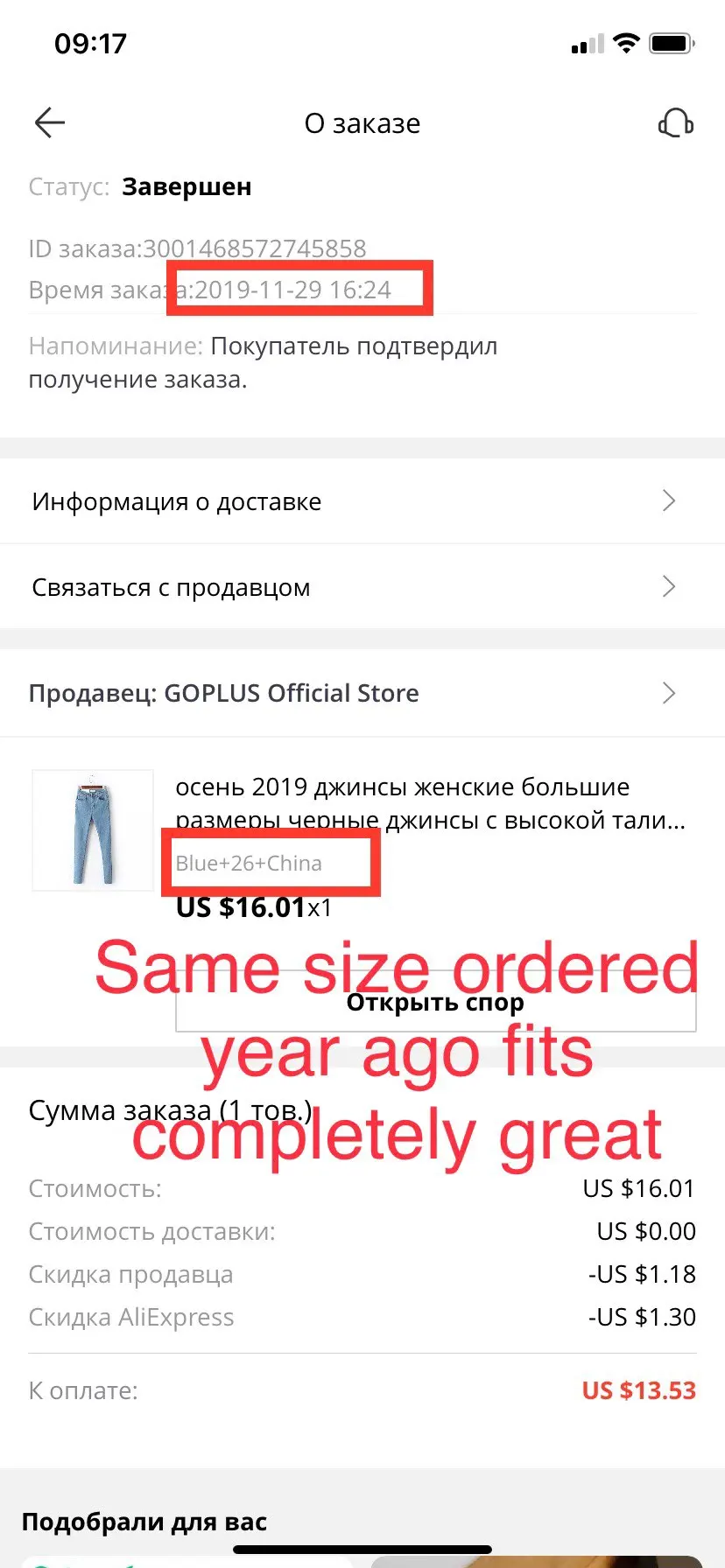 Размер слишком маленький. Я заказал 26, потому что мои параметры: талия 64, бедра 89. В соответствии с указанными размерами это 26. Более того, я заказал у этого продавца такие синие джинсы год назад в том же 26 размере, и они мне идеально подходят. В этот раз я был путается, почему Размер такой маленький, и почему он отличается от старого. Продавец пояснил, что черные джинсы действительно меньше, чем синие, но в этом нет никакой информации! Продавец не вернул мне деньги и не заменил заказ! Мы предлагаем купон на 2 доллара для будущих заказов. Это ничего не компенсирует. Очень разочарован продавцом и сервисом. Я не рекомендую покупать у этого продавца. Лучше найти похожие брюки от другого продавца. Будьте внимательны.