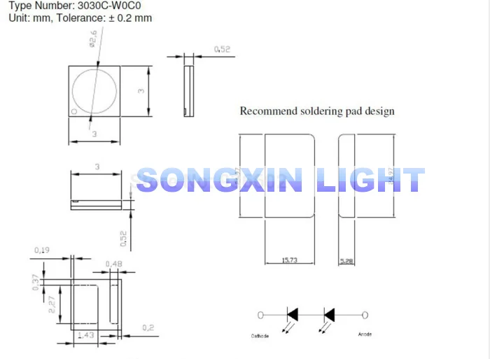 Тип светодиодной лампы: 3,0 × 3,0 × 0,52 мм L×W×H d = мм