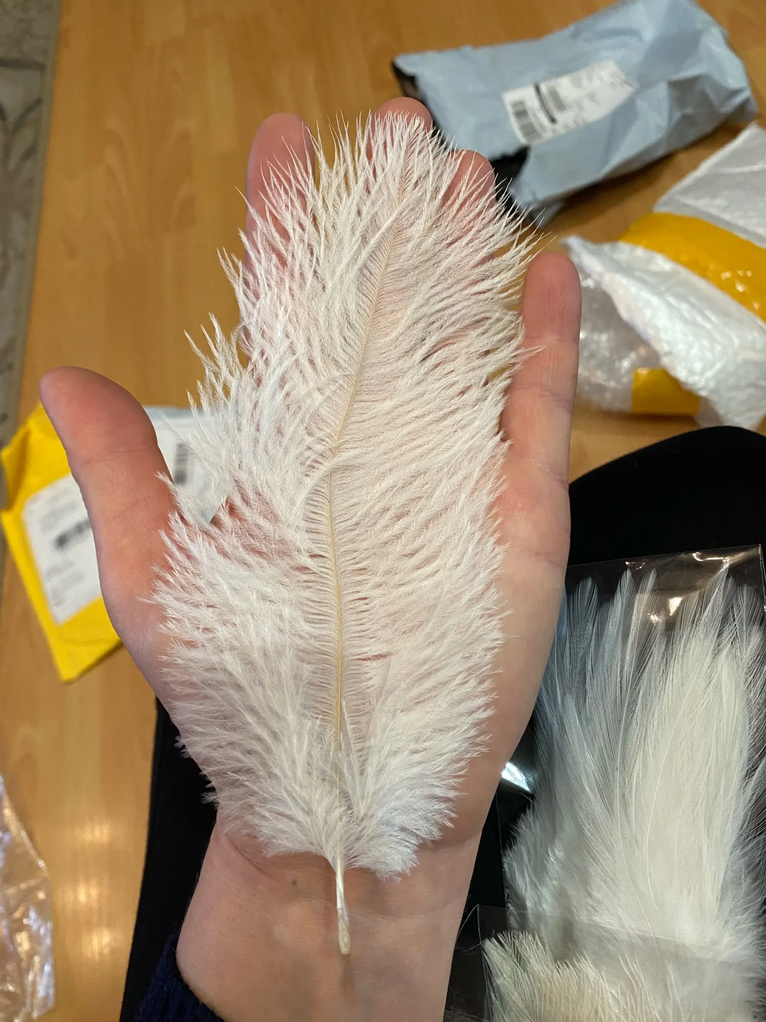 доставка в Амурскую область месяц из 20 шт 3 пера совсем маленькие, как из перьевой подушки, цвет не белый, а молочный с желтизной