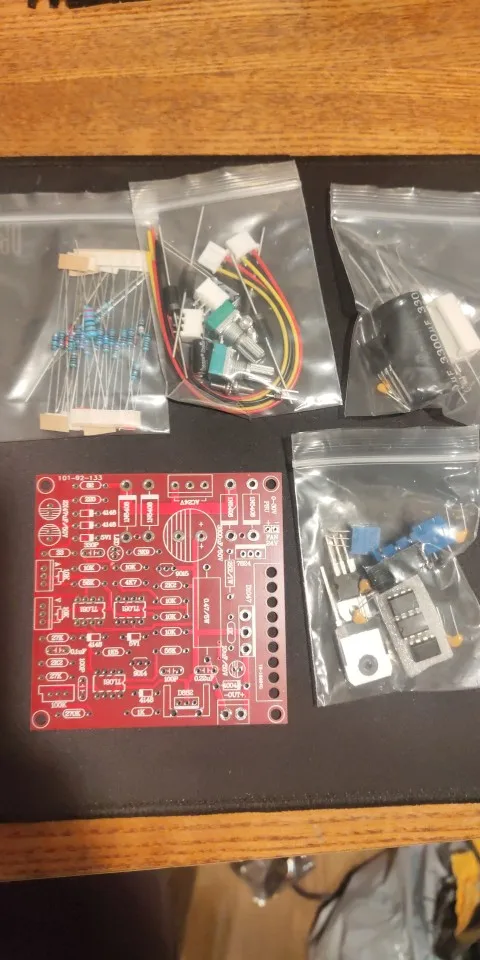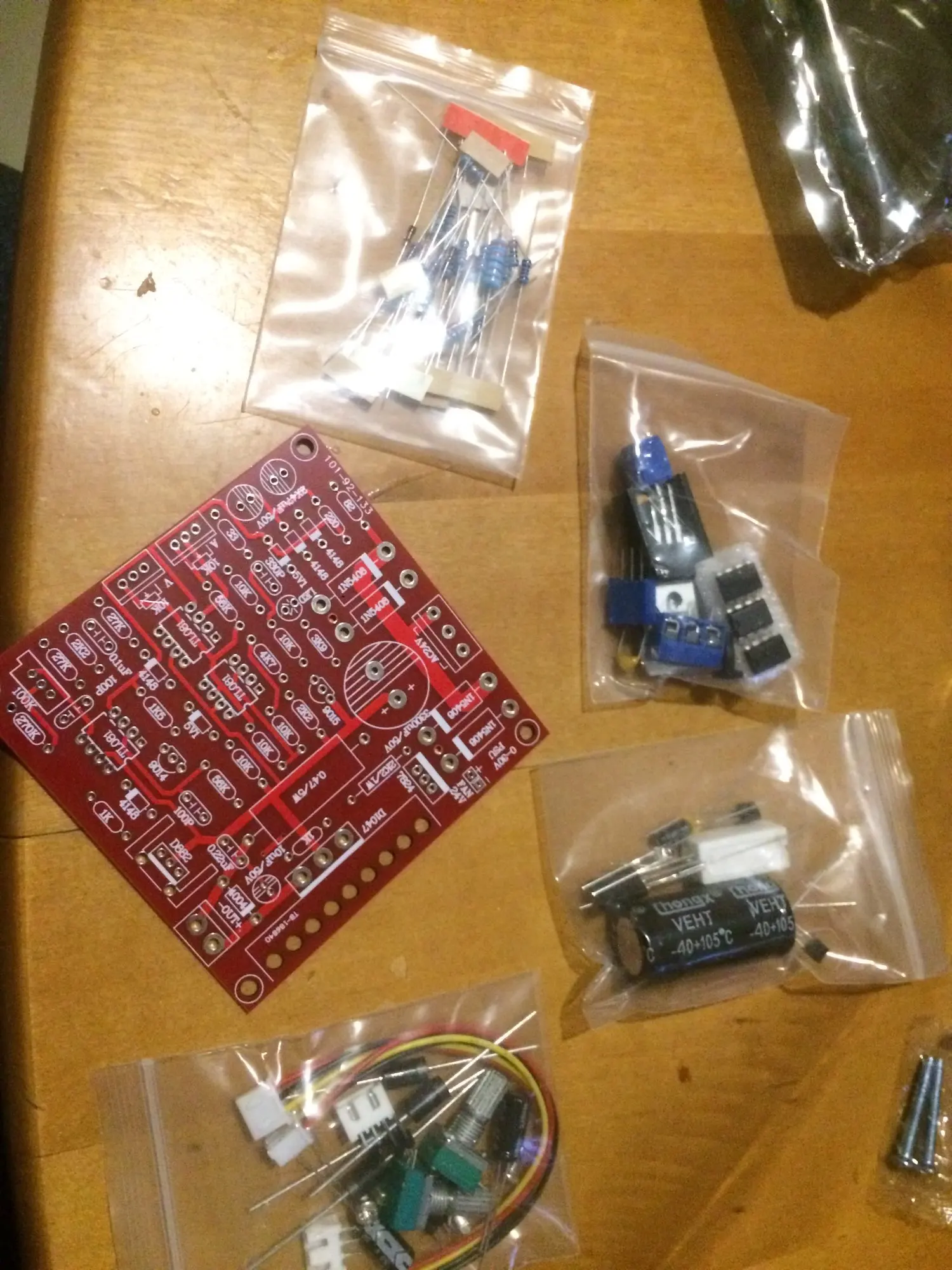 Пришло очень быстро, 3 недели! Лишний конденсатор и лишний резистор положили. ОУ не маркированы. Спаял, но еще не проверил.