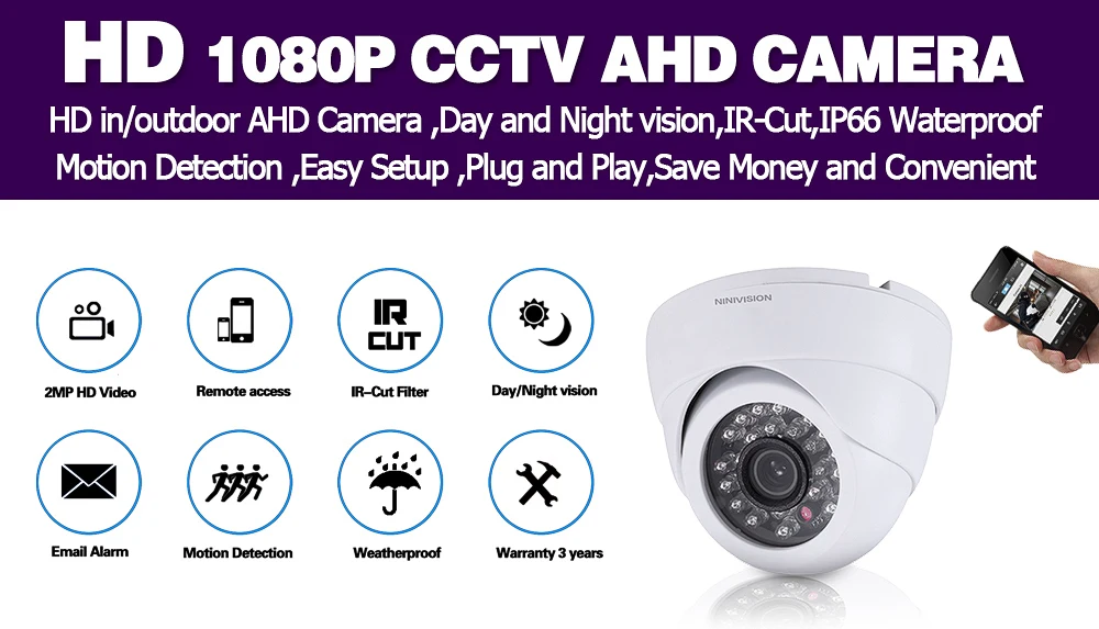 NINIVISION домашняя уличная белая купольная камера IR-CUT 2.0MP 1080P AHD камера ночного видения AHD-H CCTV камера для домашней системы видеонаблюдения