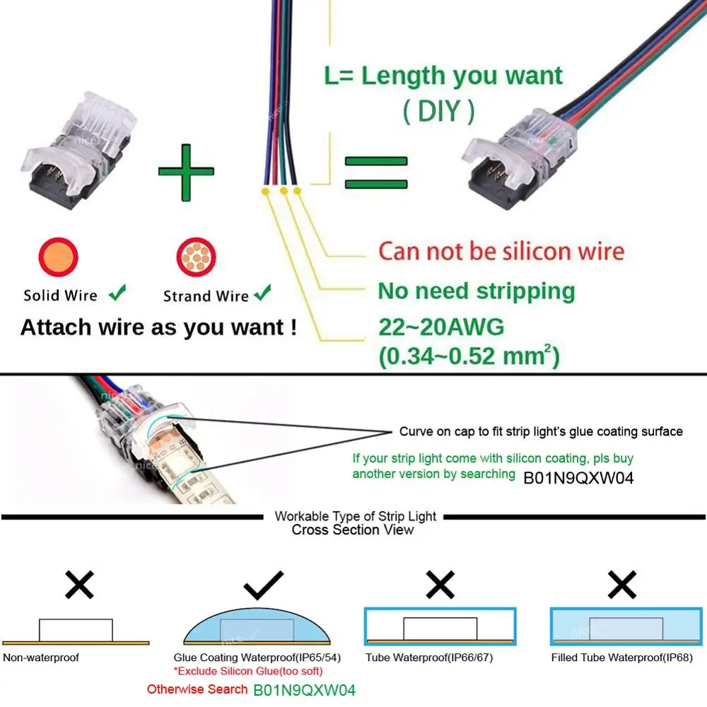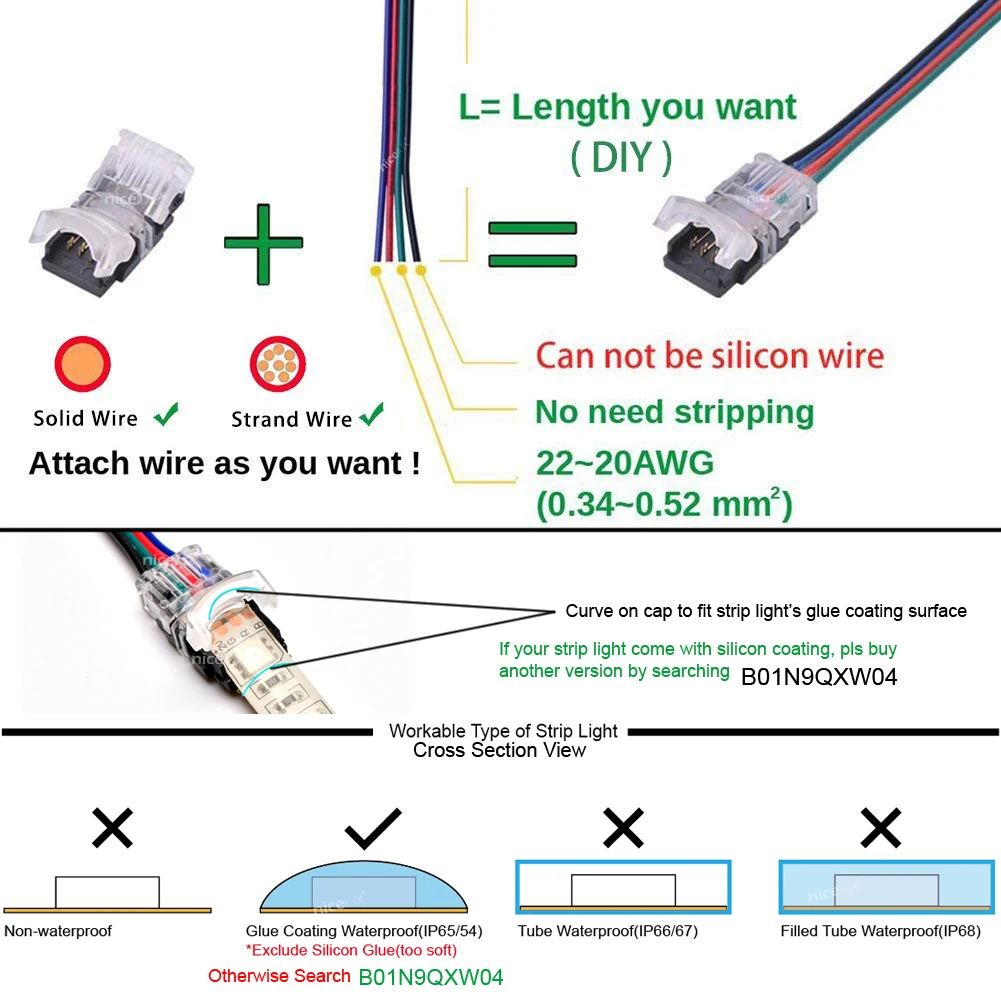 10xRGB Светодиодная лента разъем 4 Pin 5050 10 мм Водонепроницаемая IP65 полоса для провода (не включает провод, Светодиодная лента, плоскогубцы)