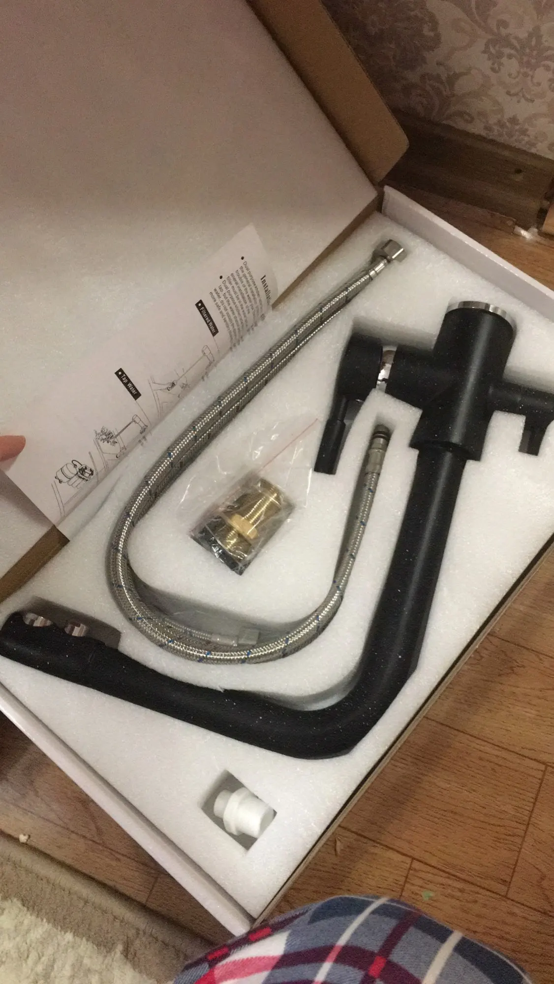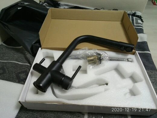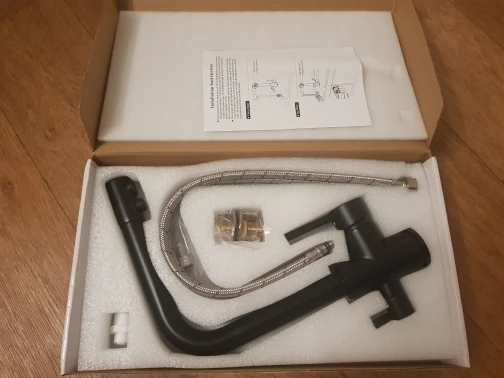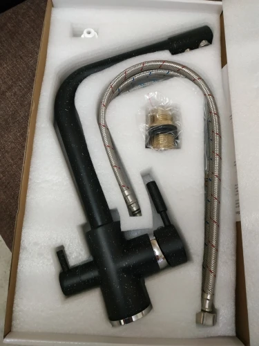 Очень быстрая доставка курьером до квартиры. Кран тяжёлый, 2100гр. В комплекте 3 подводки, муфта для подключения фильтра.
