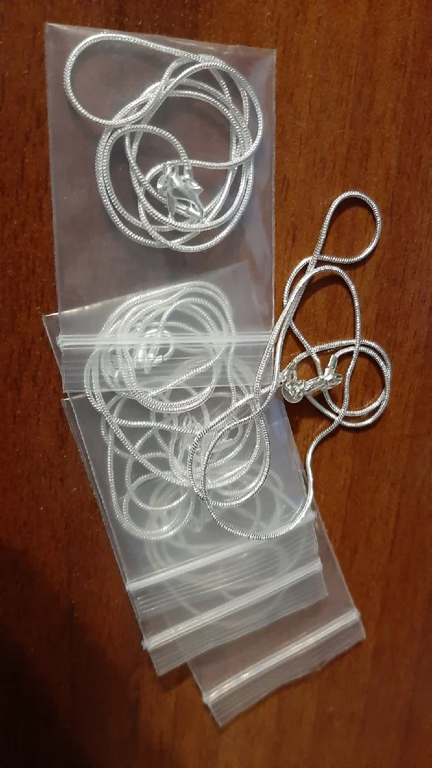 Цепочки красивые, яркие, блестят. Замочки все целые. Все одинакового плетения- змейка. Продавца рекомендую. Доставка быстрая- до Омска прибыло за 18 дней.