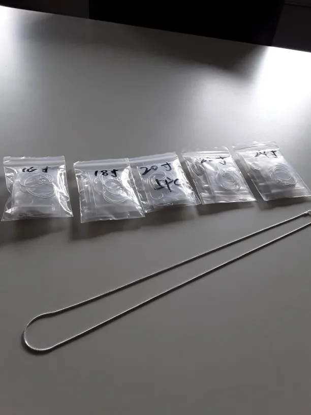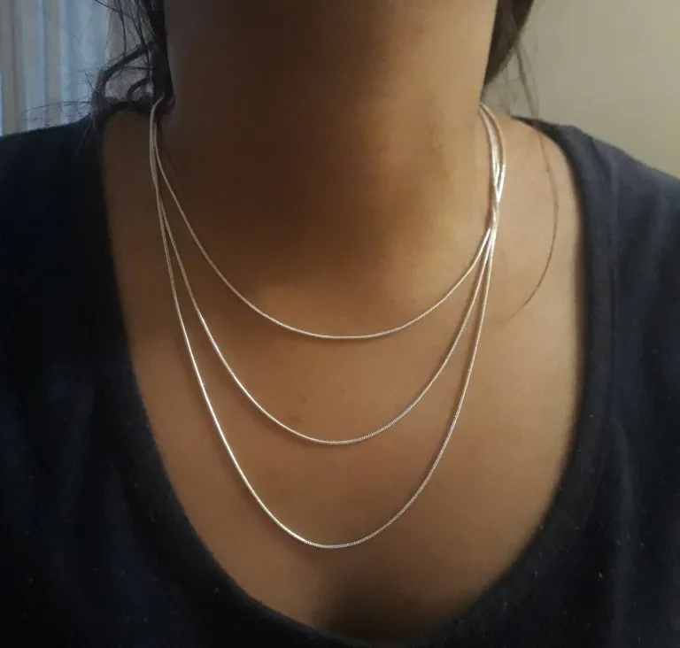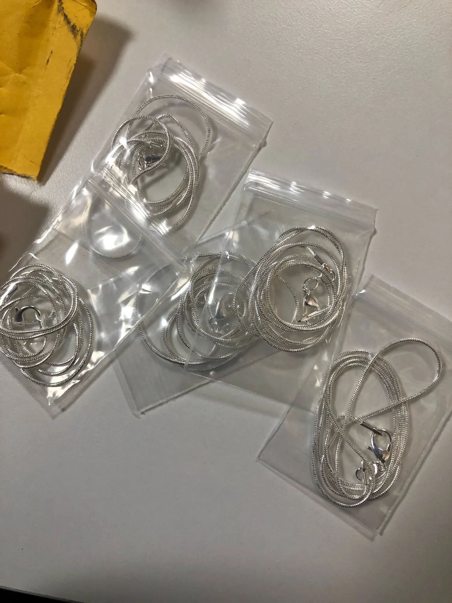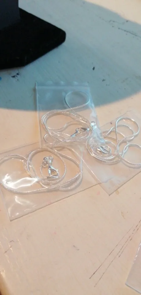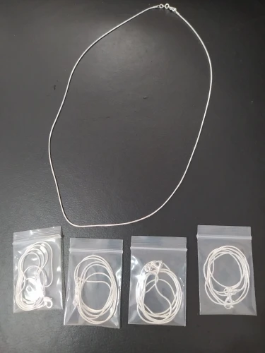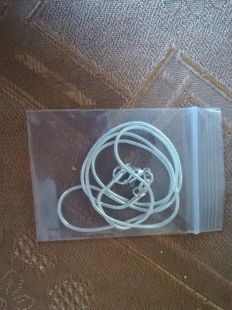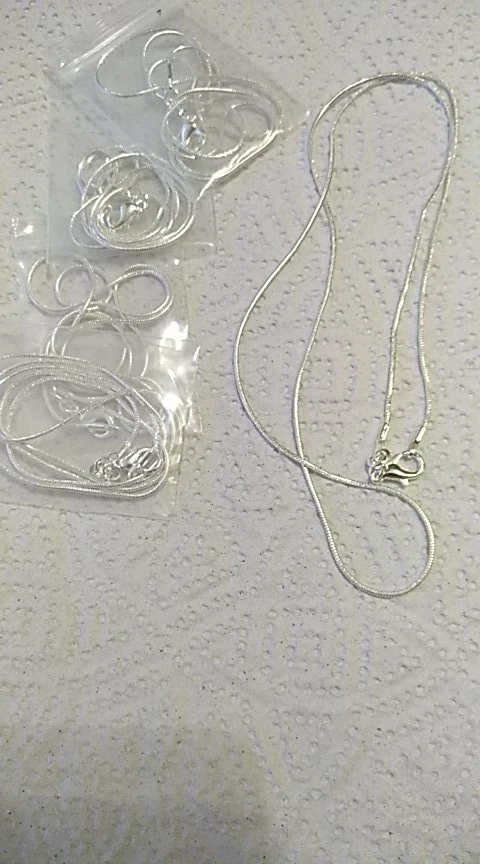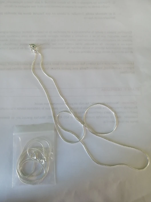 Cadena tal y como se describe , muy bien de precio, bonita, muy fina y de un color plateado muy claro. Es un lote de 5. Ha llegado pronto y estoy satisfecha con el pedido.