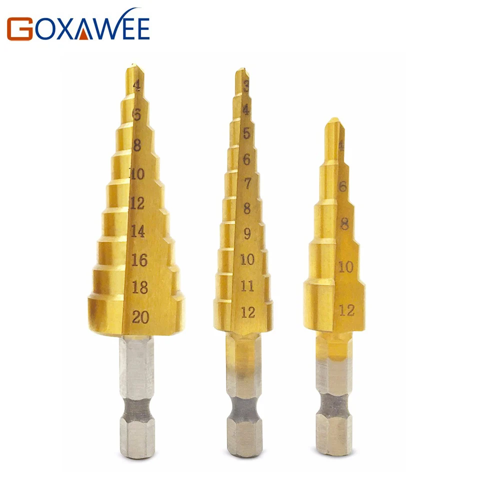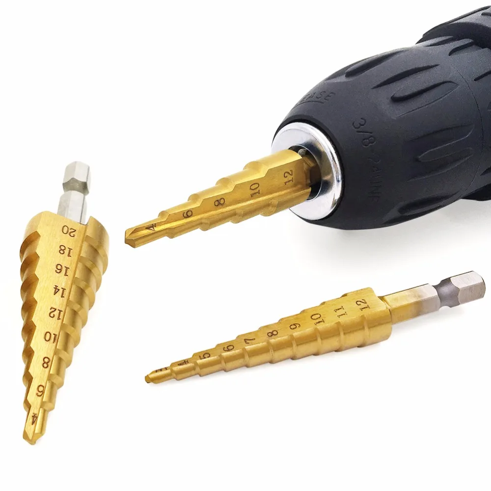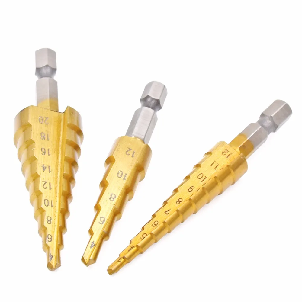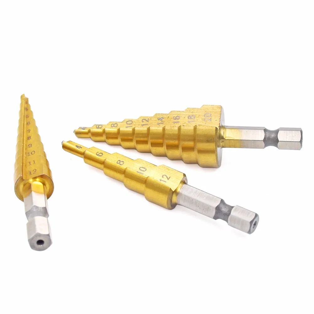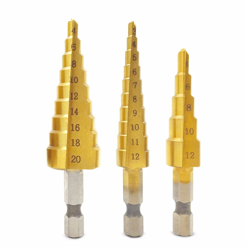 Быстрорежущая сталь, большой шаг, конусное сверло, набор титановых бит, резец отверстия, который сделан из высококачественной стали HSS, и с титановым покрытием, чтобы уменьшить трение и тепло.