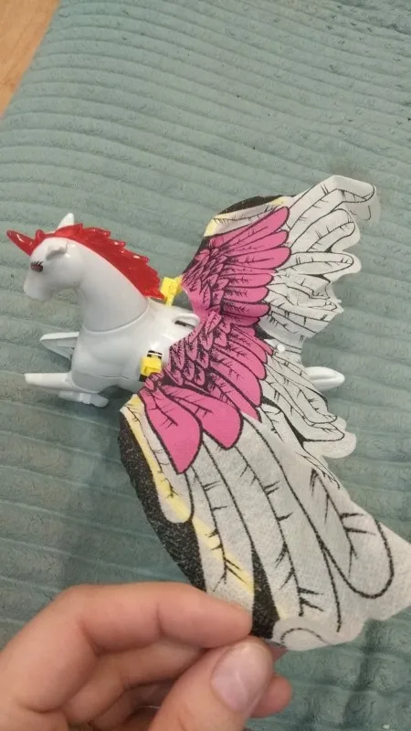 хорошая игрушка, покупала для девочки, она любит единорогов и всякие крылышки, работает от батареек, в комплекте не идут они, пальчиковые 2 шт, также есть колечко с веревкой, можно подвесить лошадку и она будет на нитке крутиться. игрушка большая, крылья особенно, глаза горят, анимированная. понравилась. покупала с купоном на 2 доллара, есть в магазине, вышла хорошая цена.
