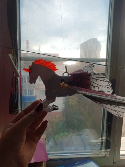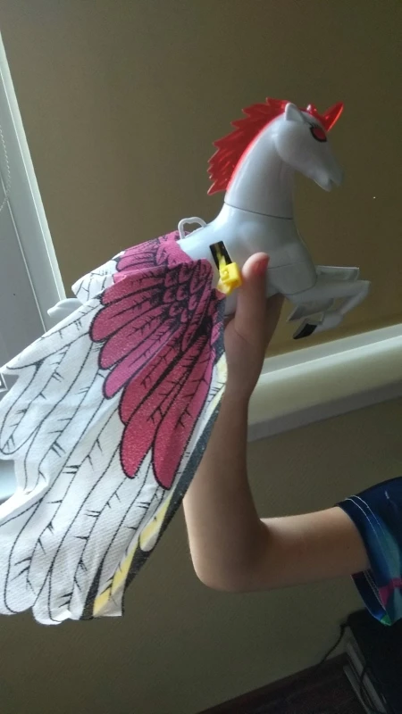 нам игрушка очень понравилась, дочь просила такую, теперь играет с куклами и этим летающим пегасом, ставит сценки. пегас можно на ниточке крутить и он летает и ржет по лошалиному, глаза мигают. размер большой достаточно. пришел заказ быстро, трек хороший, отслеживался на всем пути. упаковано илеально, в мягкую.бумагу и скотчем перетянуто. хороший продавец