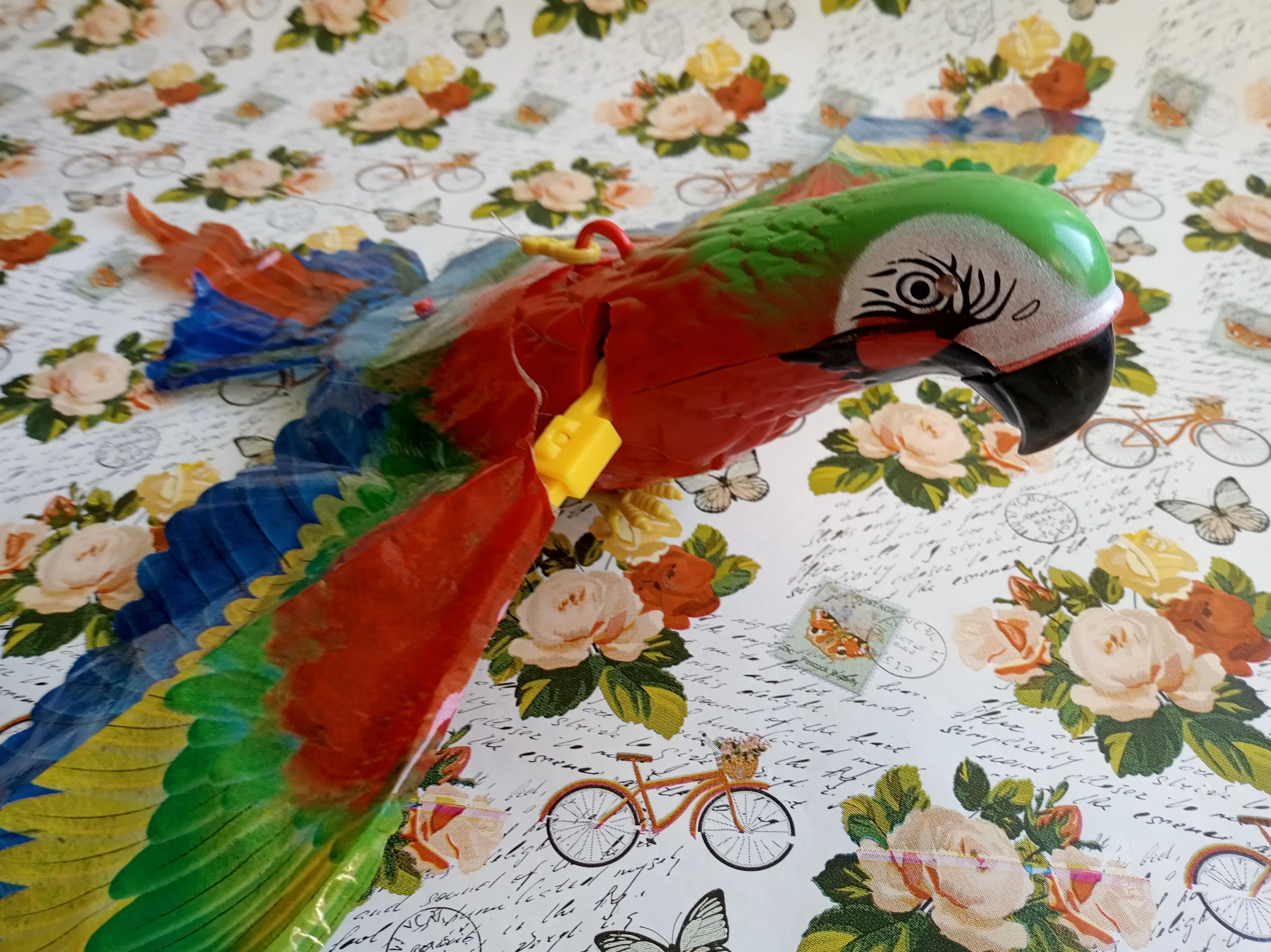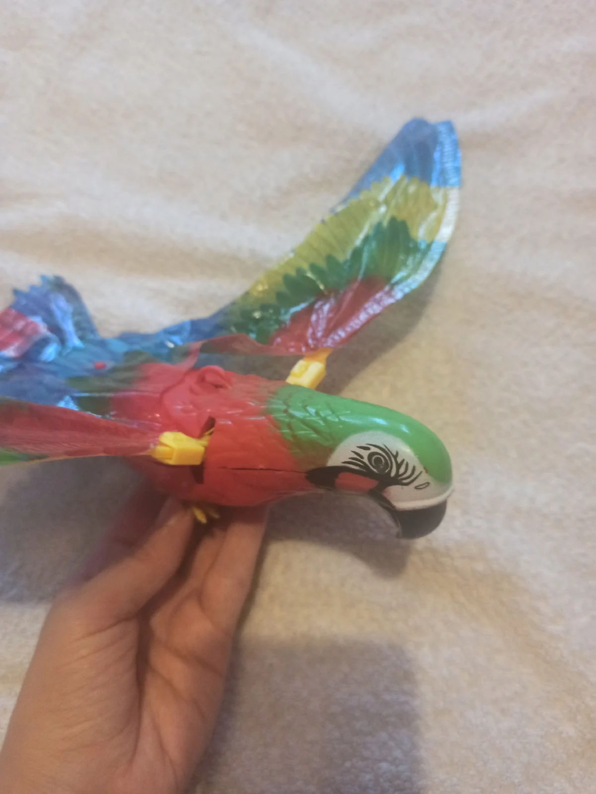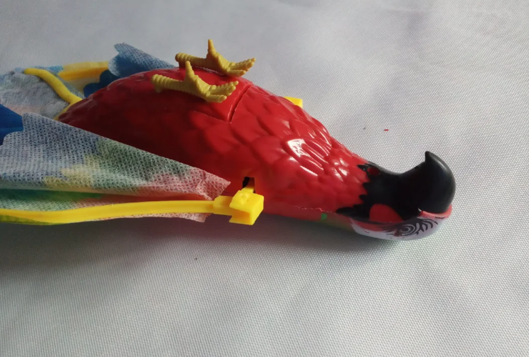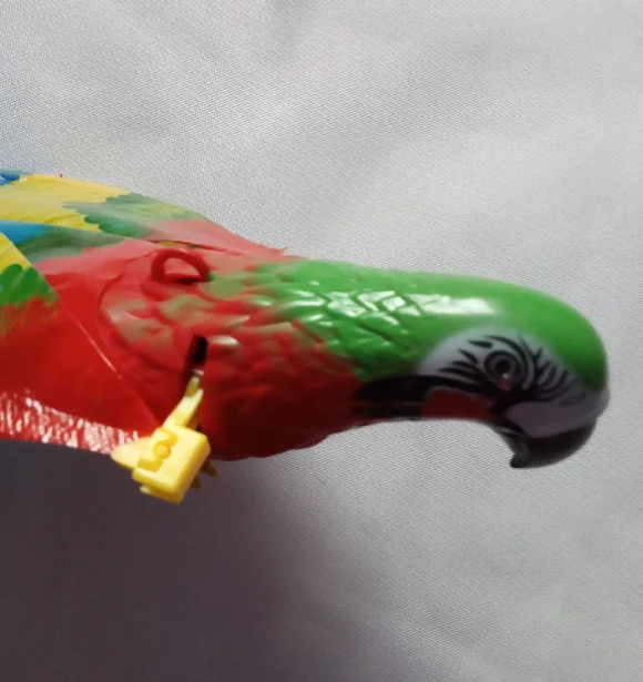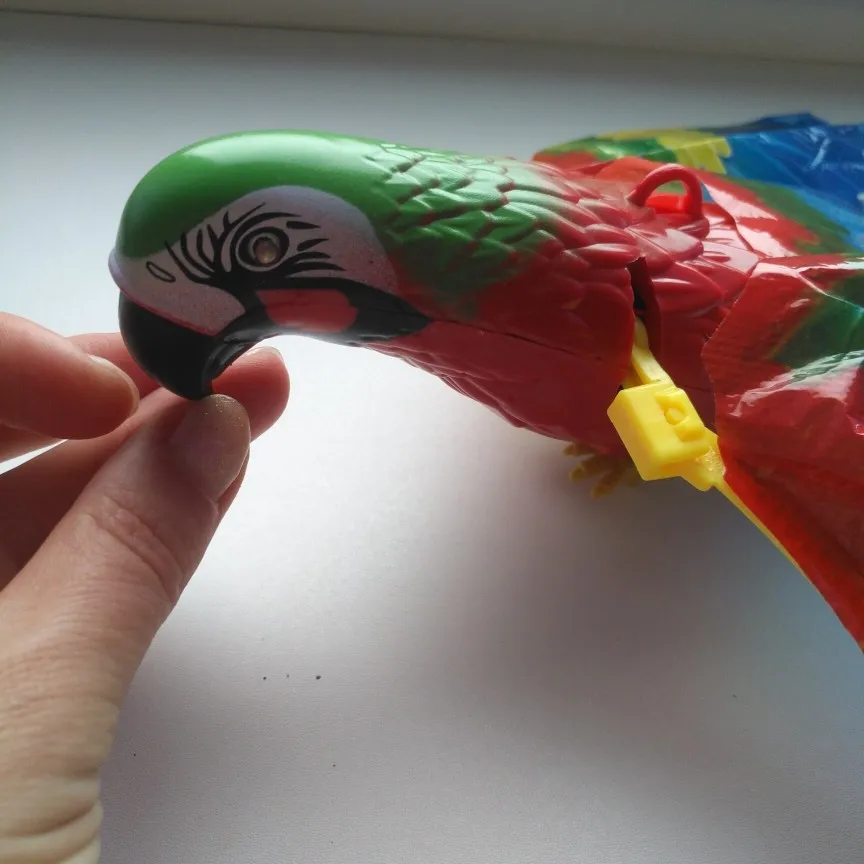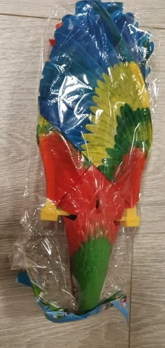 Доставка в срок до pickpoint. Попугай исправен, машет крыльями, светятся глаза, играет весёлая мелодия. Игрушка достаточно шумная, лучше бы была без мелодии совсем. Крылья из клеенки, немного мятые поначалу. Глазки прорисованы аккуратно.