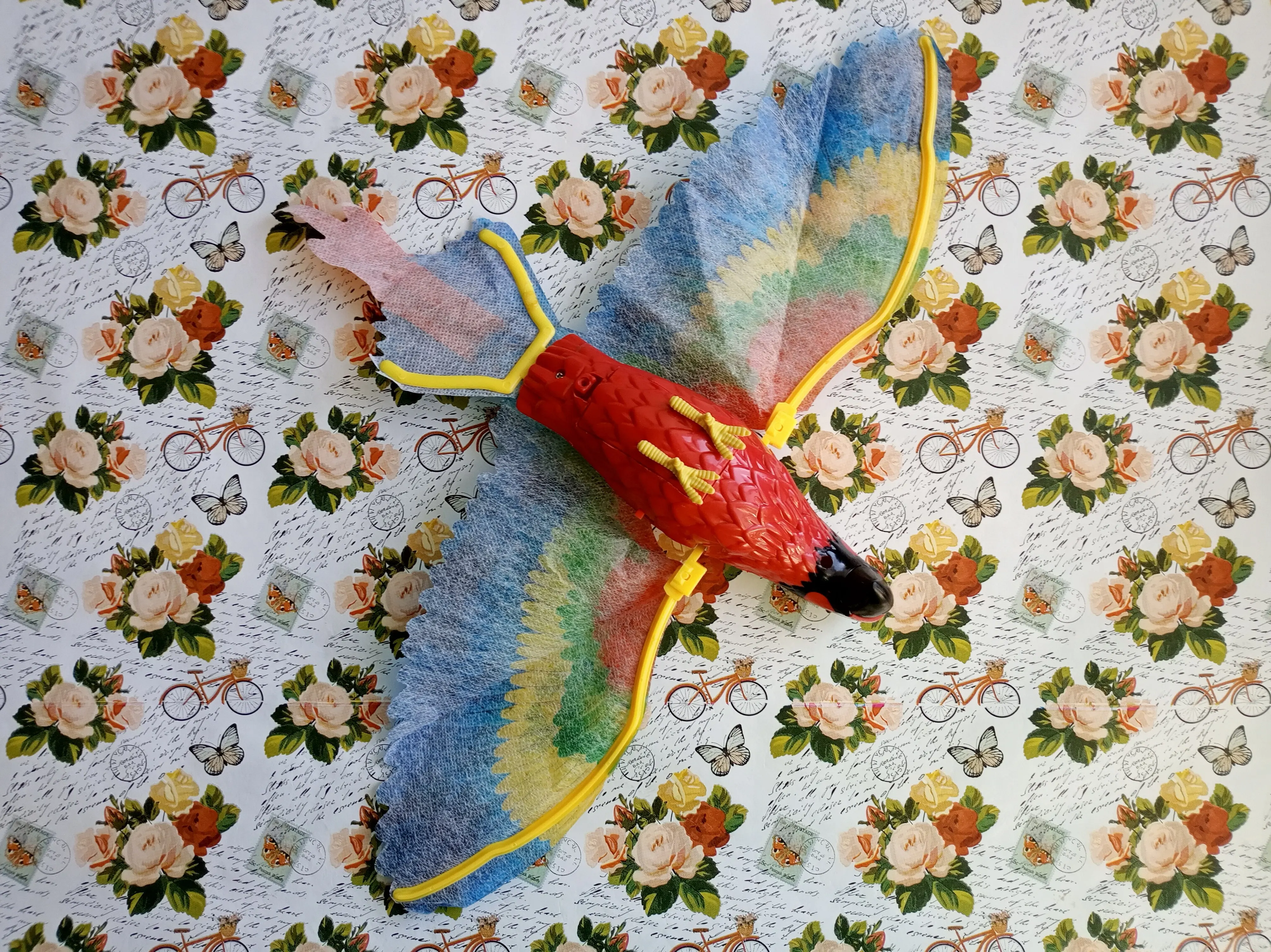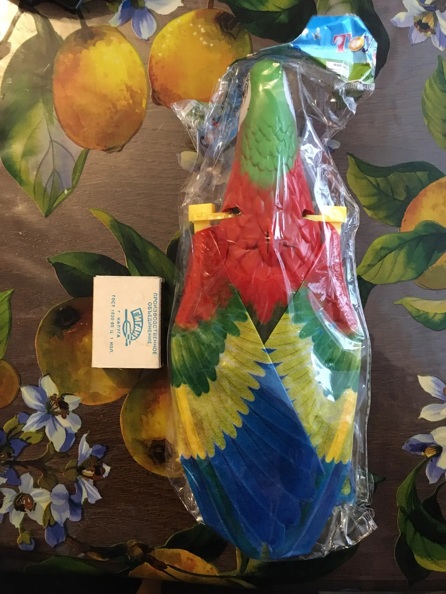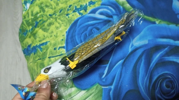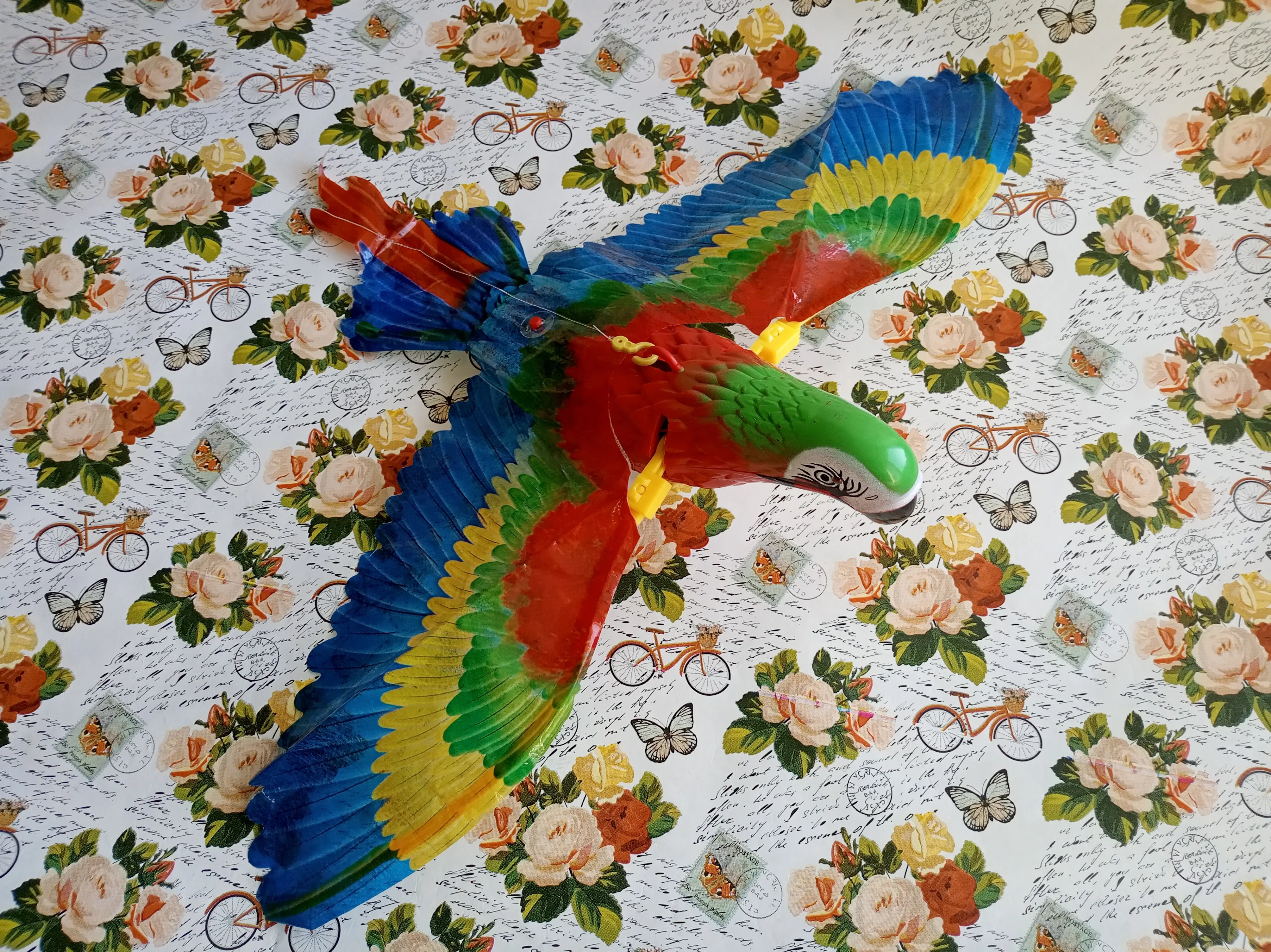 Доставка в срок до pickpoint. Попугай исправен, машет крыльями, светятся глаза, играет весёлая мелодия. Игрушка достаточно шумная, лучше бы была без мелодии совсем. Крылья из клеенки, немного мятые поначалу. Глазки прорисованы аккуратно.