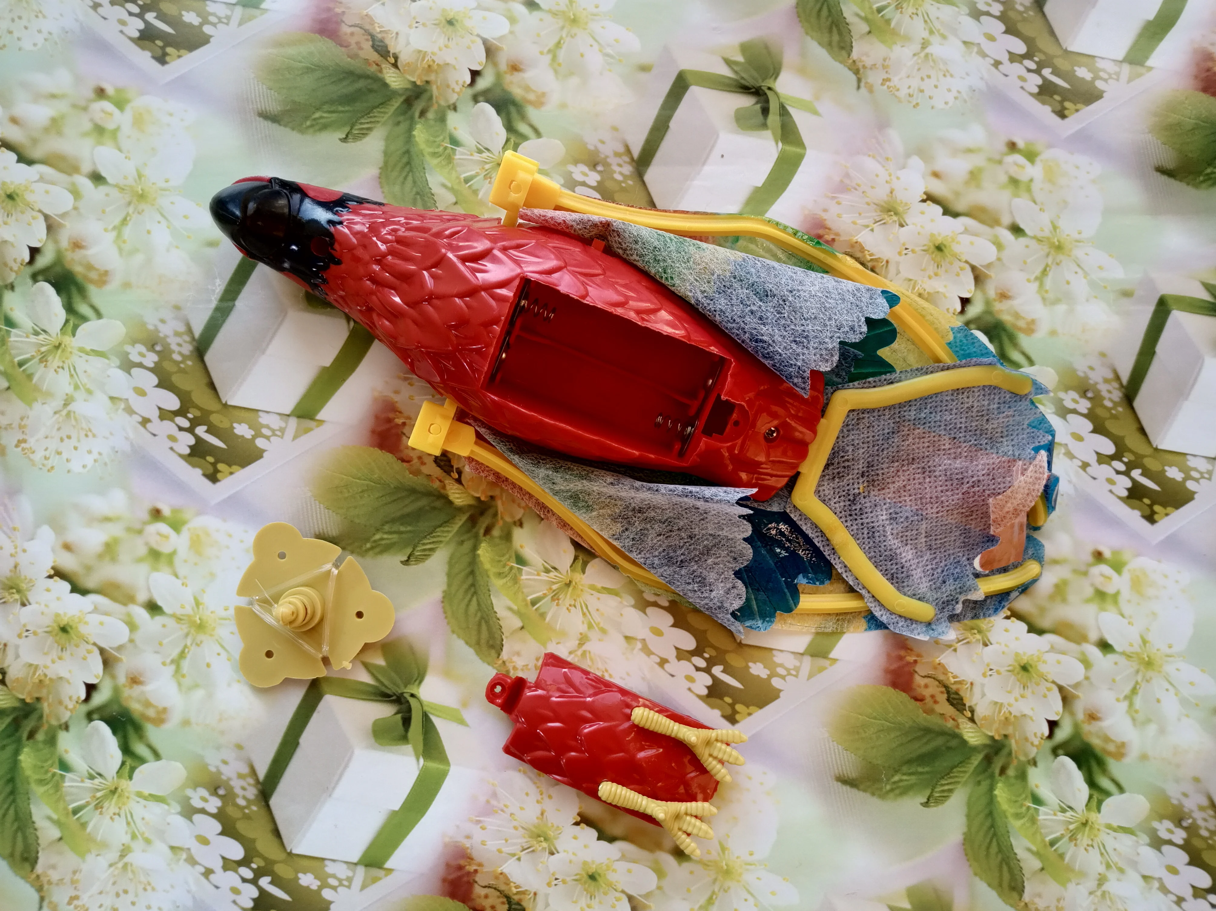 Отличная игрушка. Работает (машет крыльями, поет и светится) попугай от двух пальчиковых батареек. Игрушка сделана качественно и не имеет постороннего запаха. Продавец быстро отправил заказ и надежно его упаковал. Посылка отслеживалась на всем пути, доставка заняла 19 дней. Рекомендую товар и продавца!