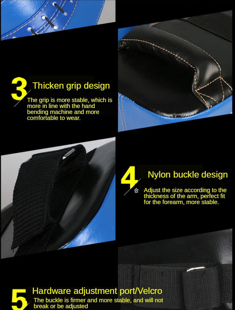 Особенности:Специальная конструкция обеспечивает большую способность поглощать удары в анатомически правильном положении стопыМеньшая площадь поверхности помогает развивать синхронизацию и заточенные комбинации скоростиРемни на липучке с заклепками, усиленные ручкиПрокладка из плотной пены для защиты и амортизацииЛегкий для дополнительного комфортаИдеальные подушечки для полной тренировки ударных ударов, локтей, УДАРОВ НОГАМИ и коленейИдеально подходит для дома и занятий фитнесомФантастический инструмент для кикбоксинга