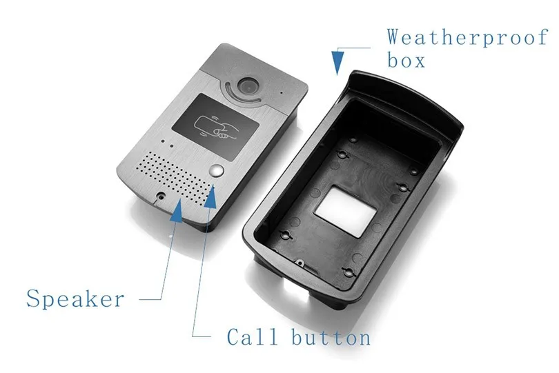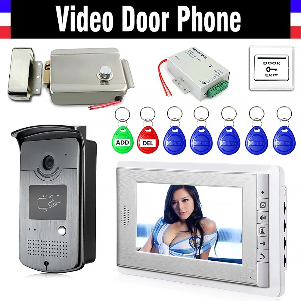 7-дюймовый экран, видеодомофон, дверной звонок, домофон, электрический замок, алюминиевая панель, камера, источник питания, дверной выход, идентификационные брелоки