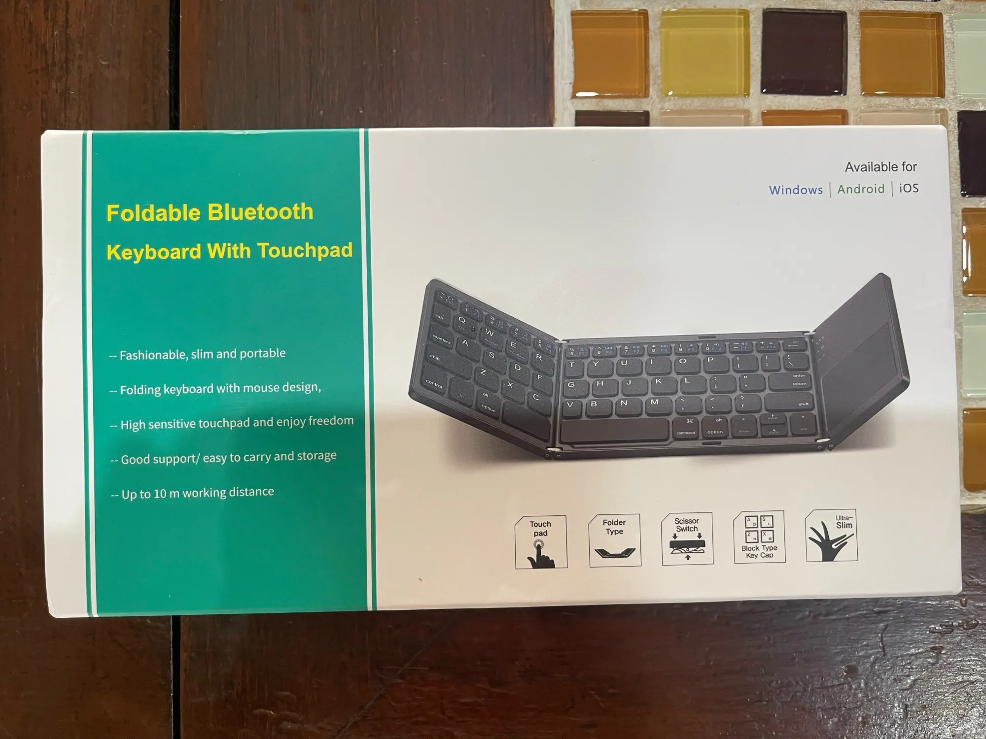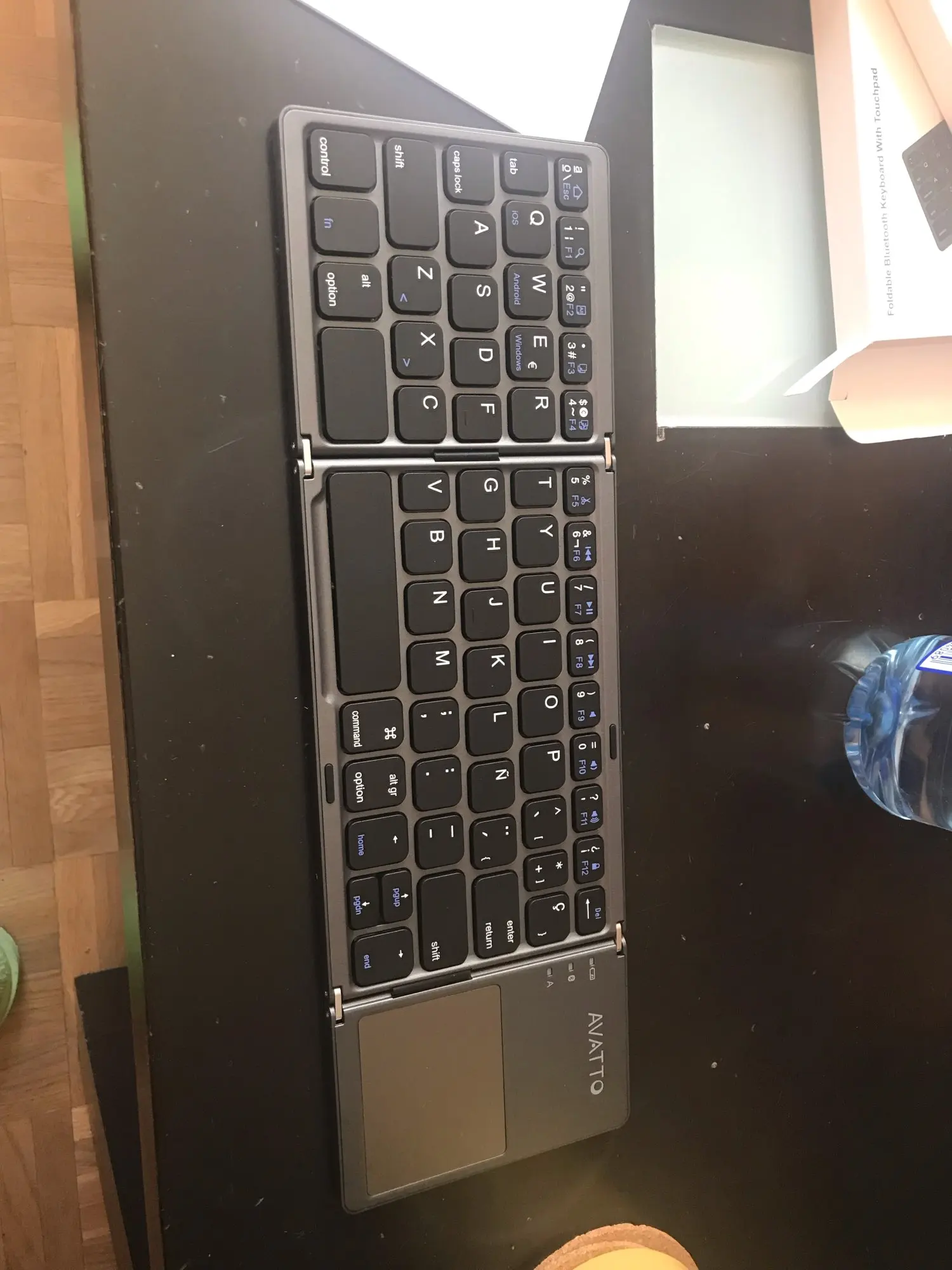 El producto llegó en excelentes condiciones. El teclado es práctico y compacto. Más el plus de tener un trackpad. Funciona en Android, iOS y Windows. Funciona muy bien. Solo una pega, que no viene con puerto USB-C para carga, es Micro-USB.