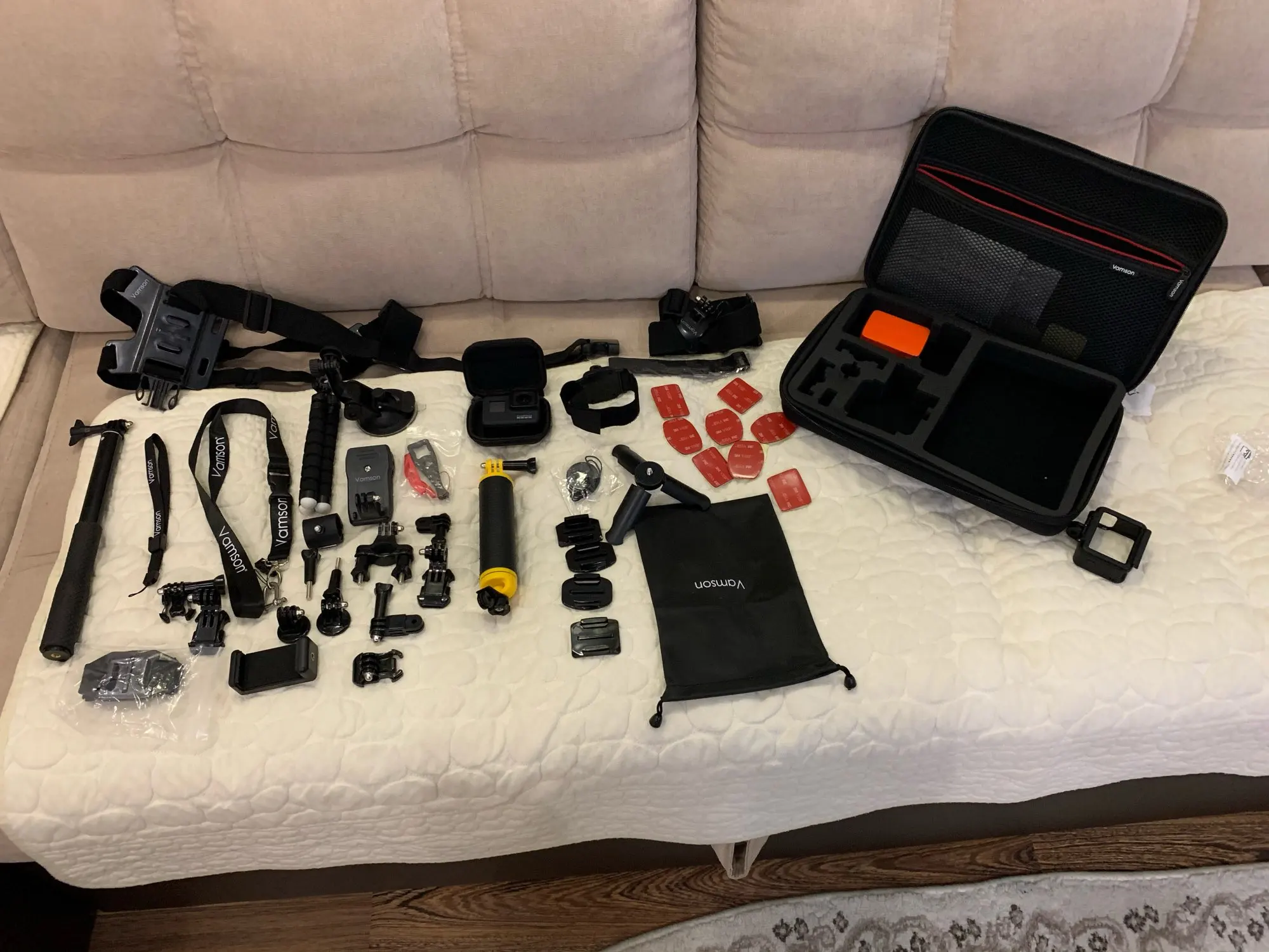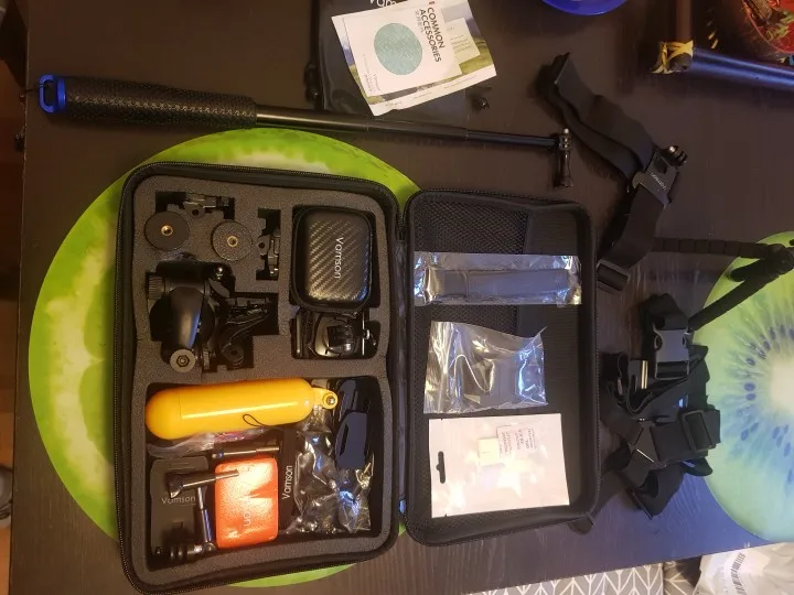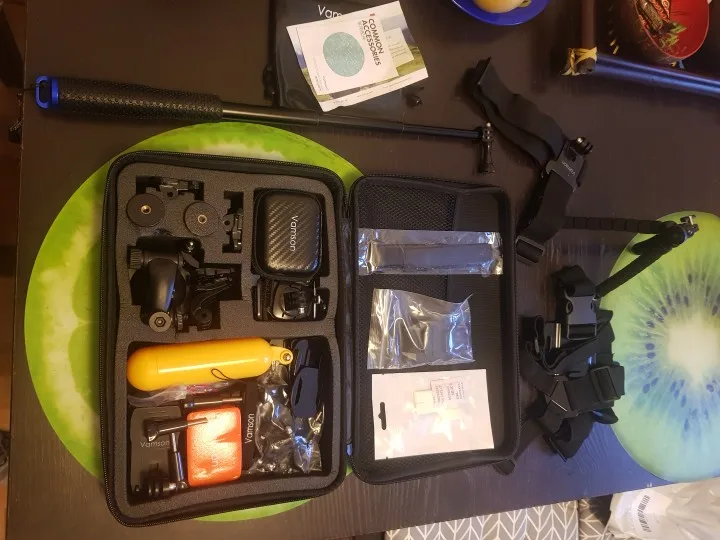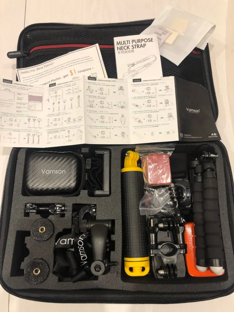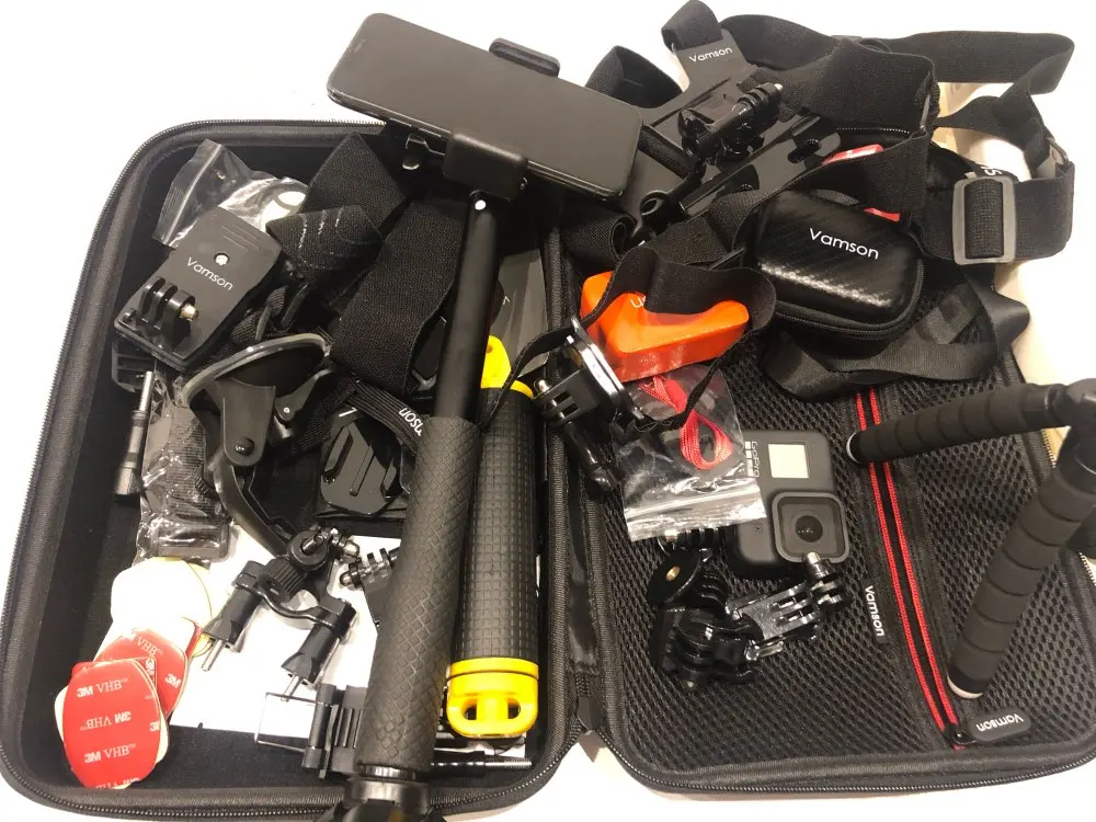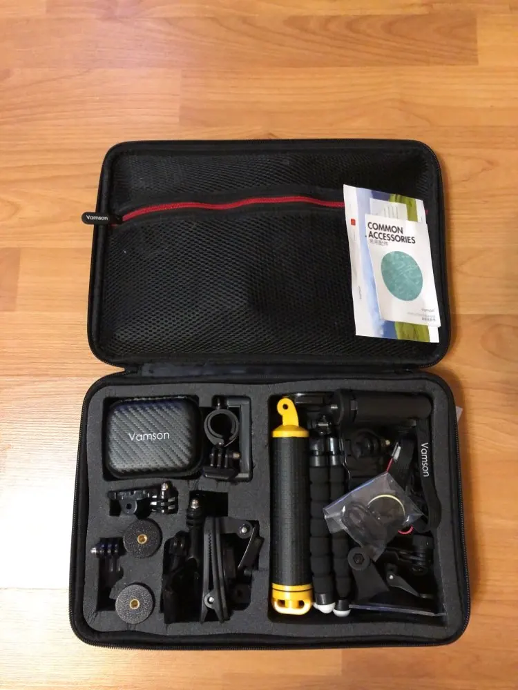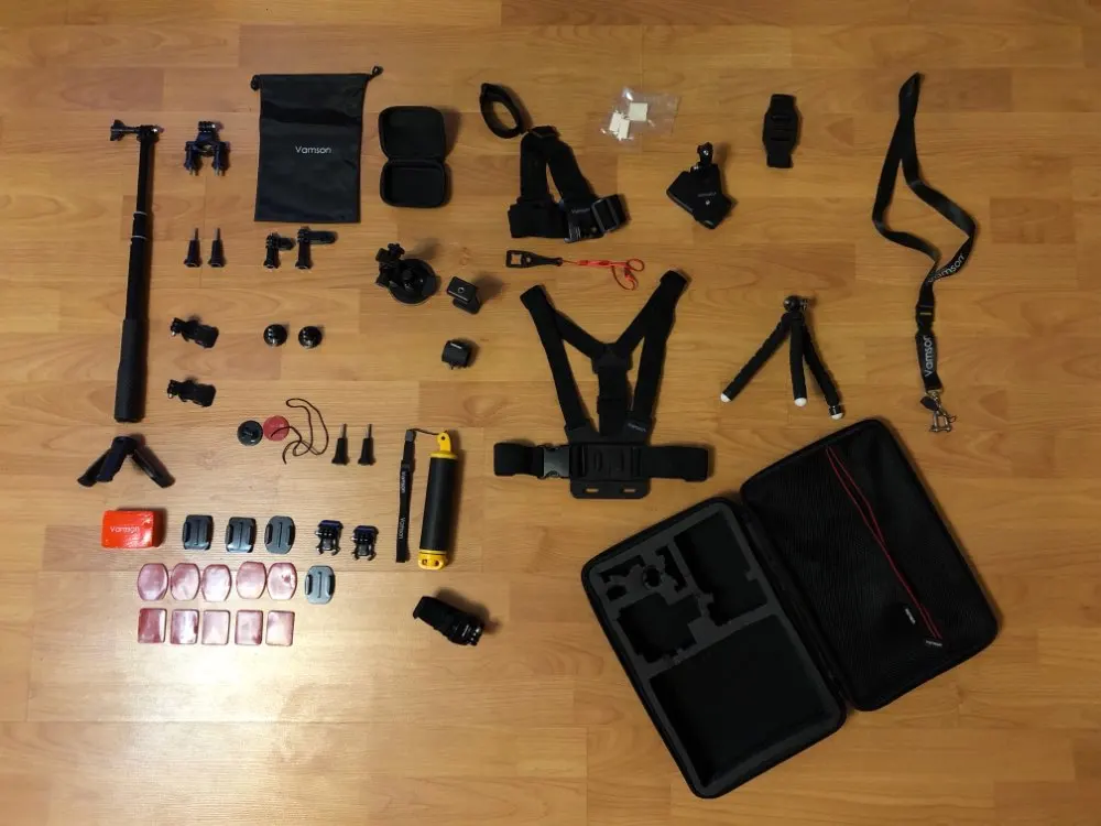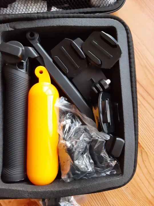 Набор отличный за свои деньги. есть все неьбходимое: крепление на грудь, на голову, на руку, палка для селфи, комплект зажимов, крепление на рюкзак, балон для подводной сьемки, водонепроницаемый мешок и кейс для камеры. хороший качественный корпус чемоданчика. очень быстрая доставка. продавца и товар рекомендую.