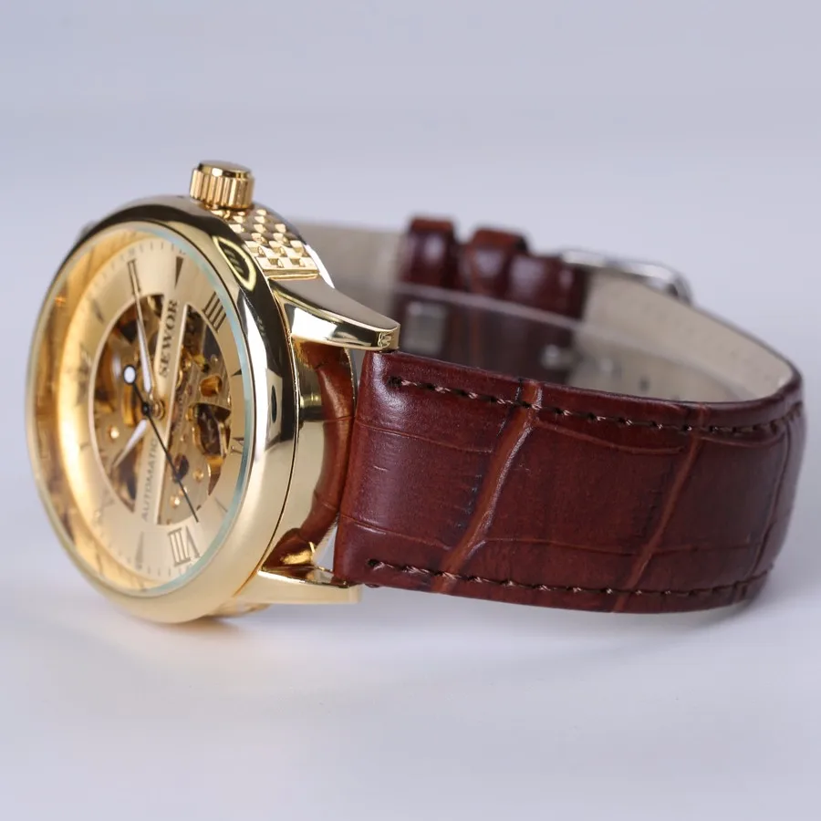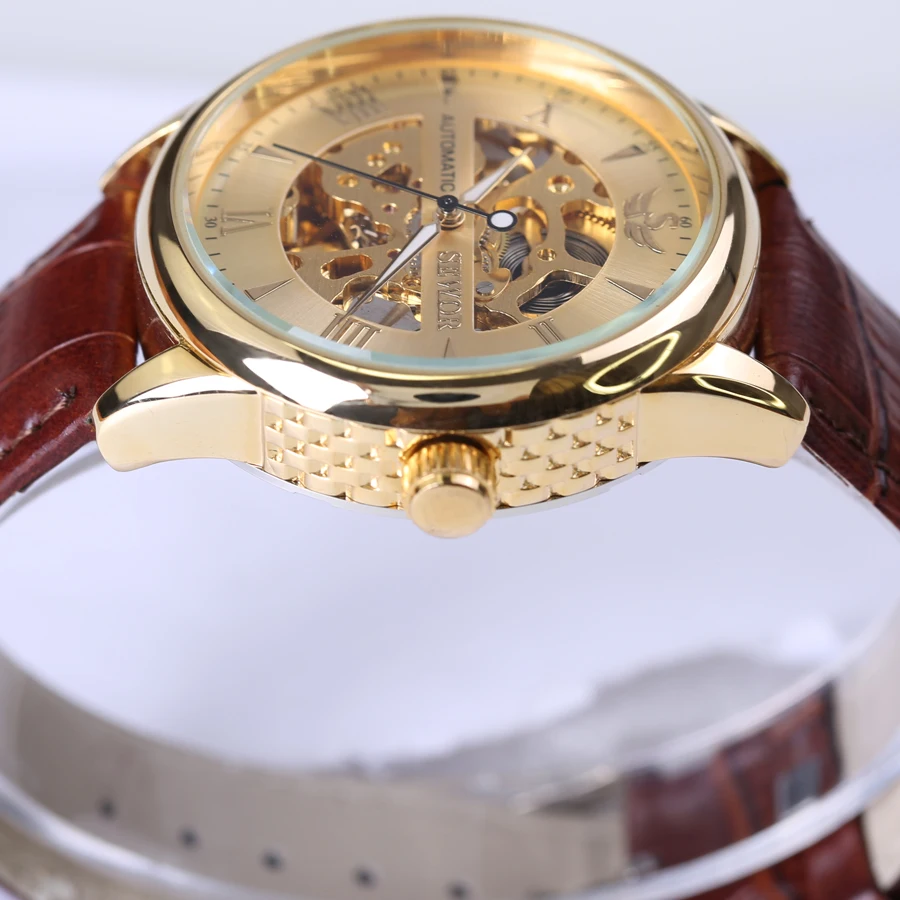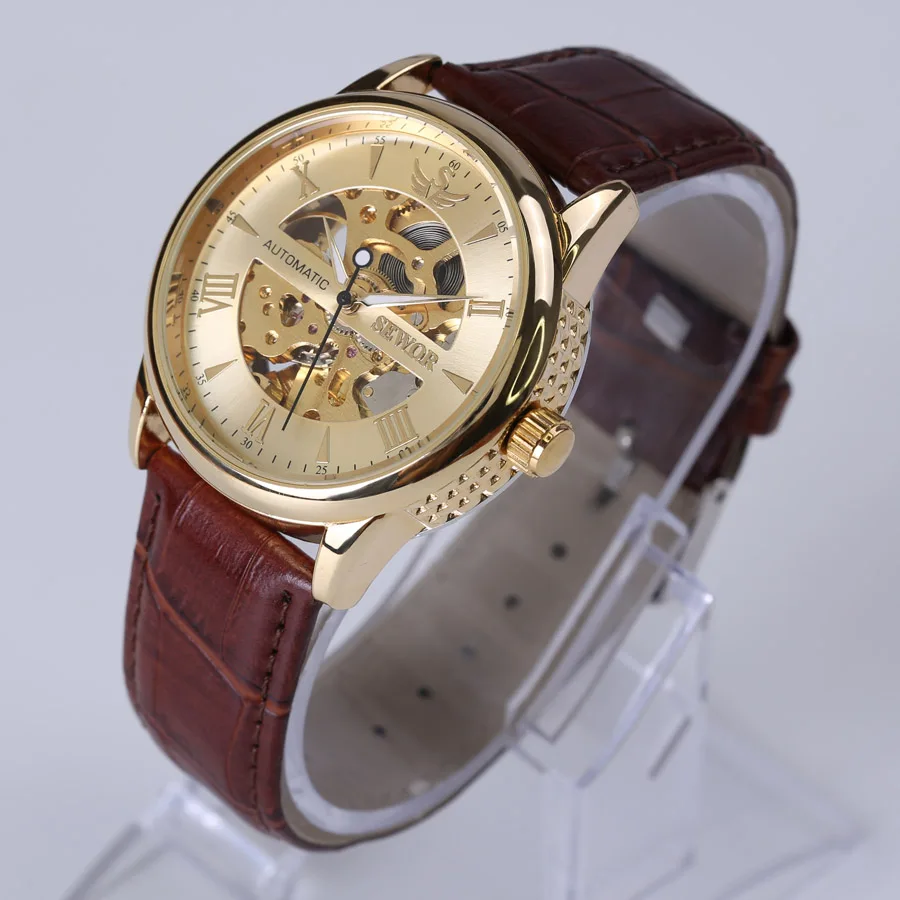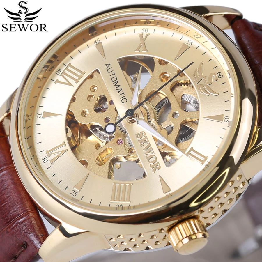 SEWOR классические серии винтажные стильные мужские часы с скелетом Топ бренд автоматические механические часы коричневый ремешок из натуральной кожи 2017