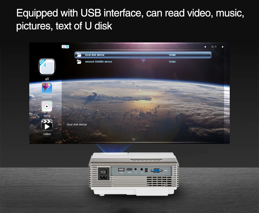 -Тип: ЖК-проектор-Тип лампы: 60 Вт Светодиодная лампа-Яркость: 2800 люмен-Срок службы лампы: около 30000 часов-Проекционное расстояние: 0,8-3,5 м-Родное разрешение: 960х720-Размер проекции: 20-120 дюймов-Рацион изображения: 16:9, 4:3 Совместимость-Контрастность: 1800:1 (полный вкл/выкл)-Максимальное разрешение: WUXGA(1920X1200)-Трапецеидальная коррекция: ± 15 ° вертикальная ручная коррекция-Zoom & Foucs: ручной Foucs & цифровой зум-Встроенные динамики: 5Wx1-Поддержка видео формата: MPG,MPG-1,MPG-2,MPG-4,AVI,MP4,DIVS,TS,TRP,WMV,RM,RMVB-Поддержка аудио формата: MP3,WMA-Поддержка формата изображения/текста: JPEG,PNG,BMP,PGM,TXT-Входной/выходной порт: VGA,HDMI * 1,USB * 1,AV, наушники, ATV-Источник питания: 100-240 В переменного тока/50-60 Гц