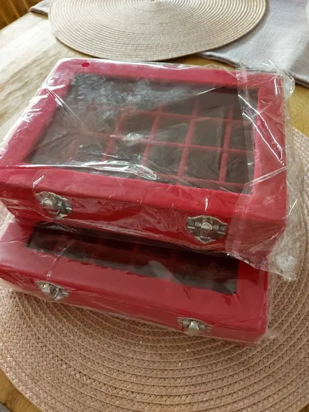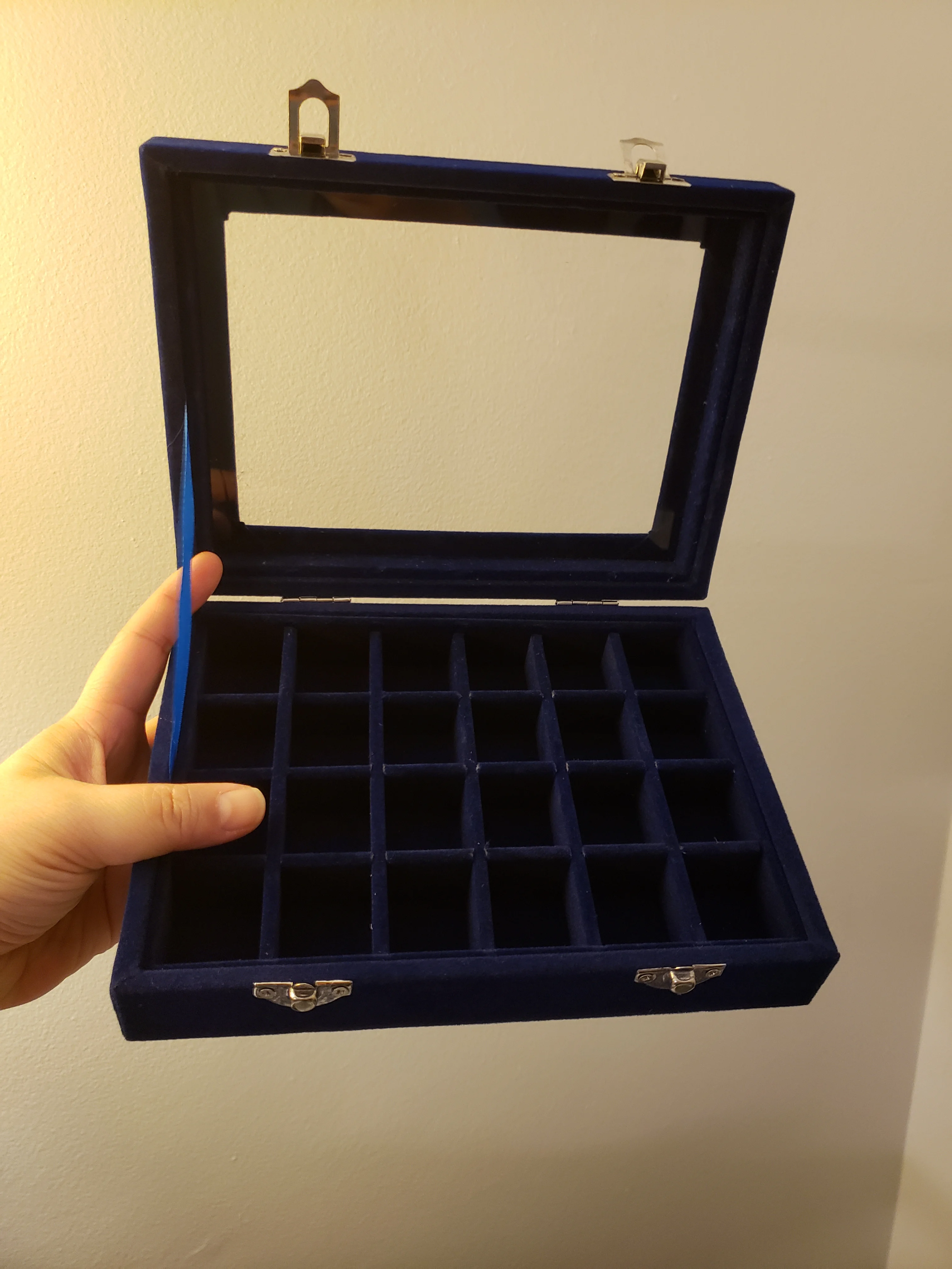 Черный хороший, и я также купил синий. Они довольно хорошие и прочные. Особенно учитывая цену, это очень хорошая коробка. Размер 6x8x2 дюйма. Каждый из 24 отделений составляет около 1x1,2 дюйма. Отделения удаляются, если вы хотите использовать пустую коробку. Внутренние карманы приклеены к прессованной доске, но они на удивление прочные. Остальная часть коробки также покрыта бархатом. Верх-стекло. Есть защелка, которая фиксирует крышку вниз. Единственная причина для 4 звезд вместо 5 заключается в том, что существует какой-то химический запах. Я только что получил его, поэтому, возможно, он исчезнет позже? В любом случае, я купил два и очень доволен. Если мне нужно больше, я буду покупать у этой компании, и этот продукт снова точно. Обычно доставка может быть до 60 дней, но эта упаковка действительно пришла через 2 недели. Очень быстро!